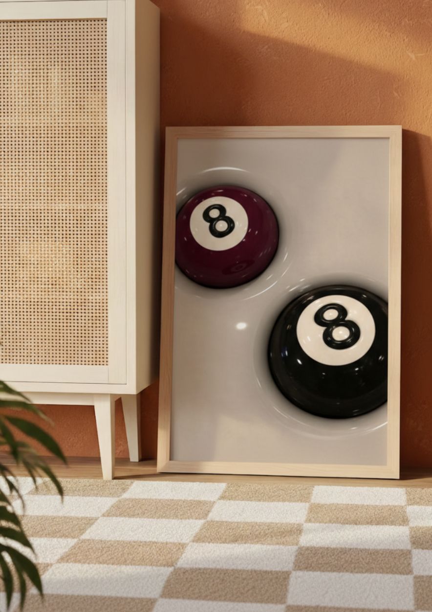 Transform your space with this striking Modern 8 Ball Pool Print, a unique blend of retro aesthetics and contemporary surrealism. This high-quality wall art features two 8-balls—one classic black and one deep plum—seamlessly embedded into a sleek, ivory-colored liquid surface. The 3D-inspired design creates a captivating visual depth that pulls the viewer in, making it a perfect centerpiece for any room.