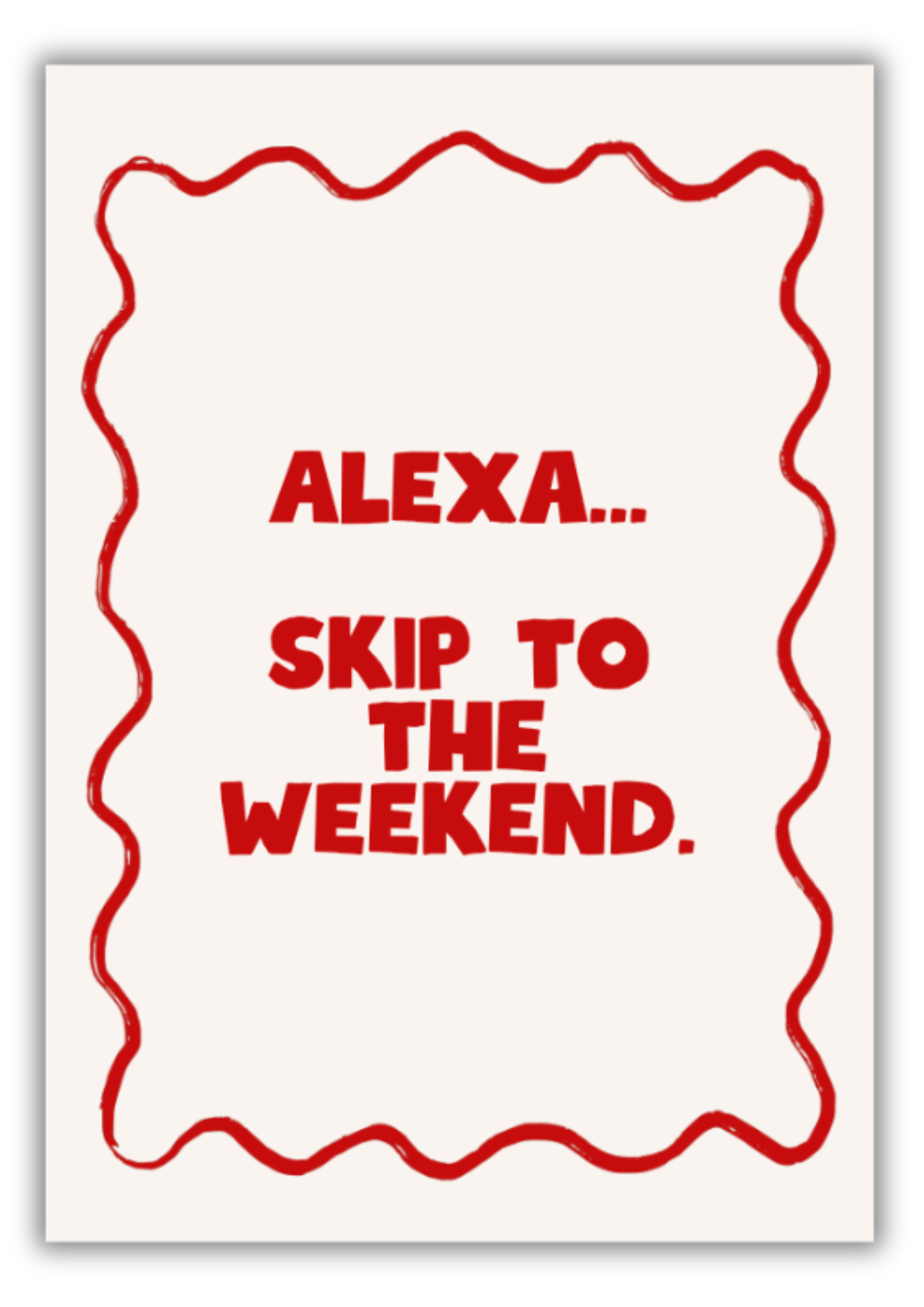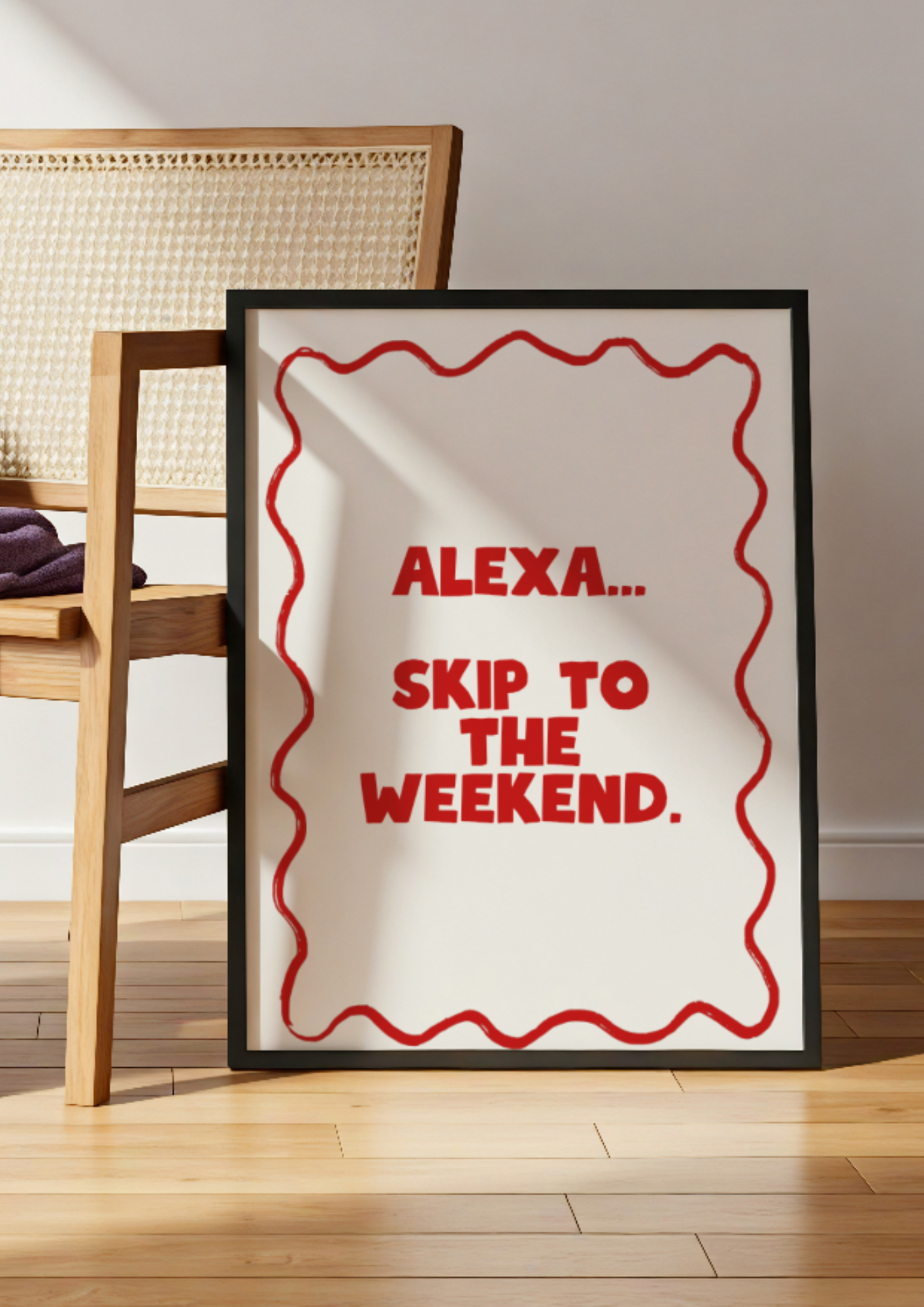 Bring a much-needed dose of humor and relatable wit to your home office, living room, or workspace with this modern, bold, typographic print. Featuring the iconic wish, “Alexa… Skip to the Weekend.” in striking, deep red lettering, this piece is the perfect conversation starter for anyone counting down the days until Friday.