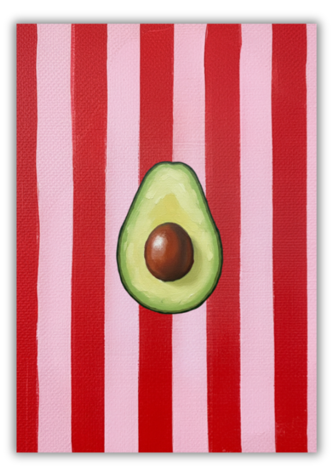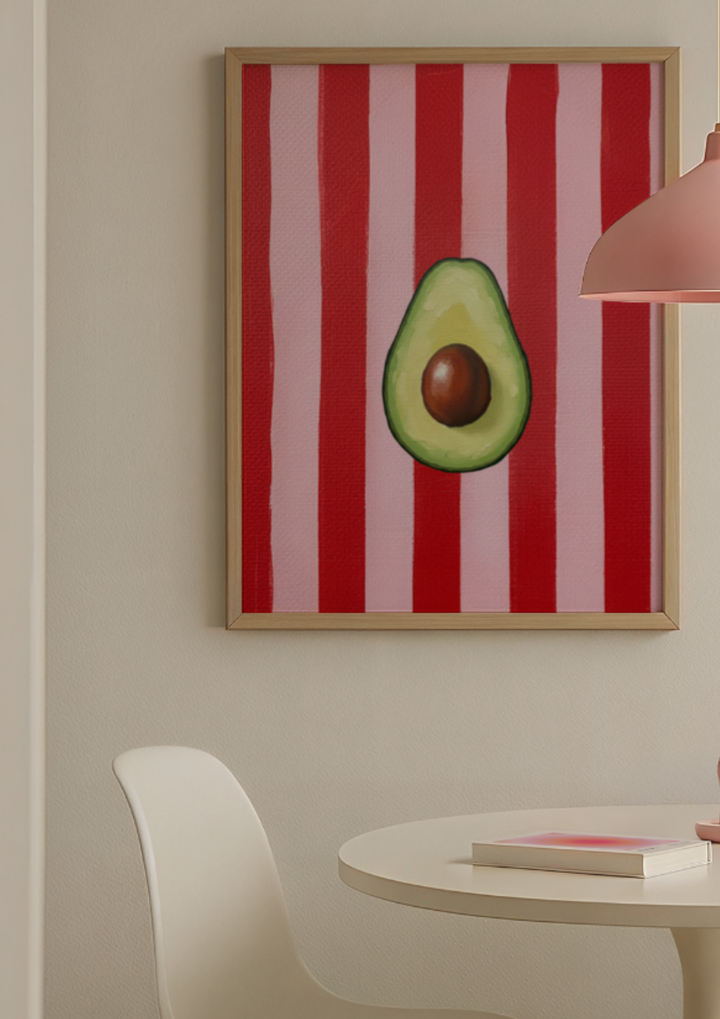 Discover the perfect blend of modern maximalism and playful colour with this Vibrant Avocado Print . This striking poster features a detailed, realistic illustration of a sliced avocado, complete with its rich brown pit, set against a dynamic and eye-catching background of bold red and soft pink vertical stripes.