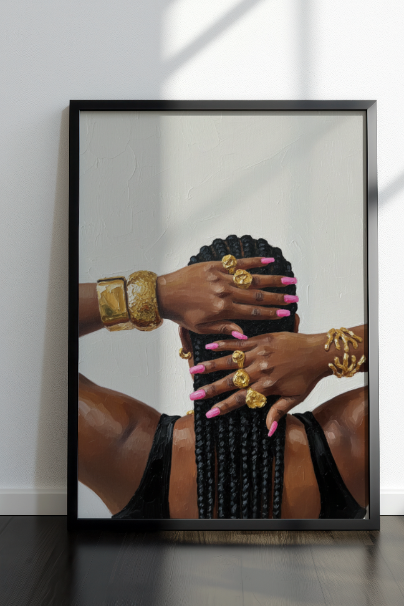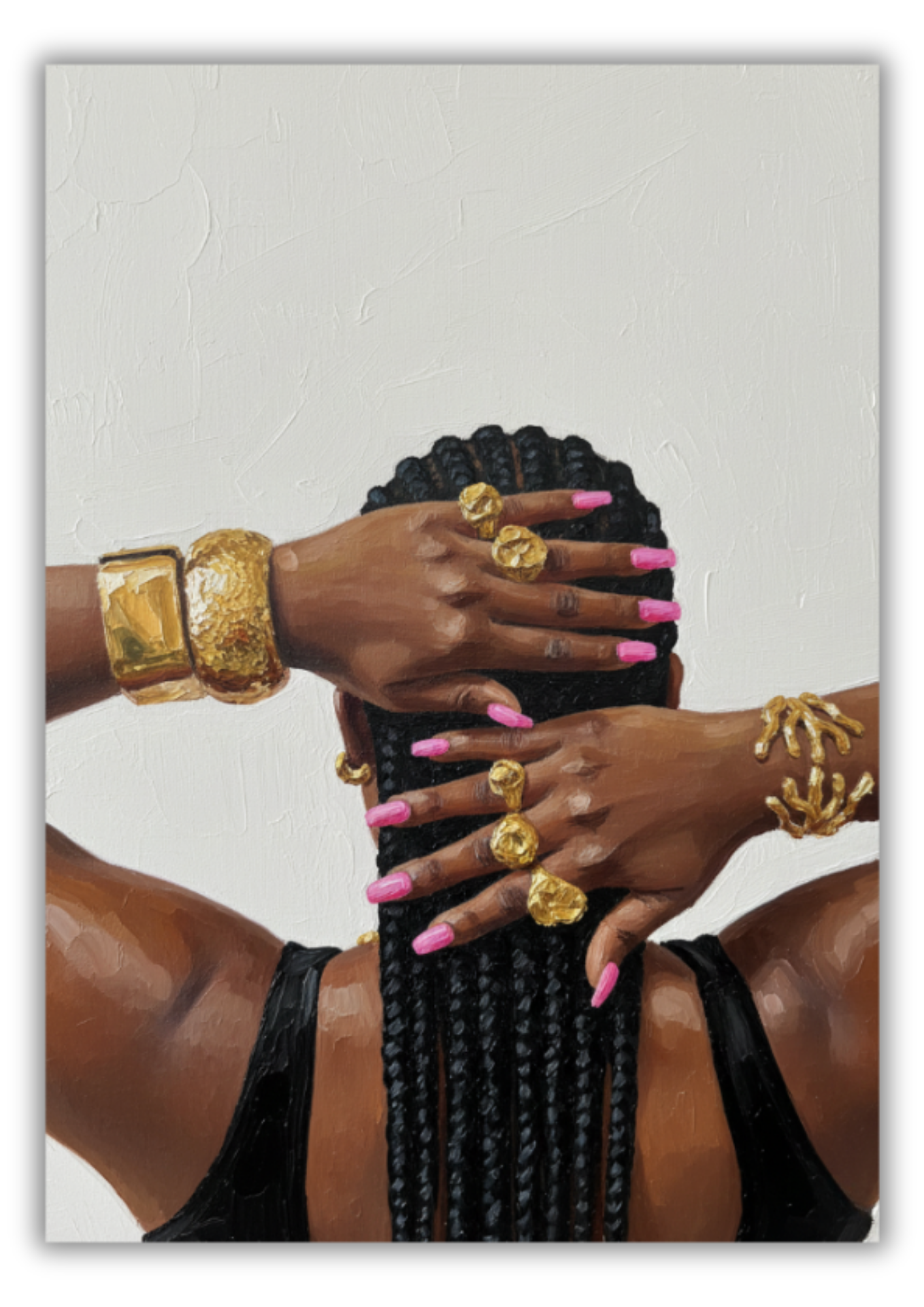 Bold Braids & Gold Statement Jewelry Art Print |  Oil Painting | Pink Manicure Hand DetailBold Braids & Gold Statement Jewelry Art Print | Oil Painting | Pink Manicure Hand Detail