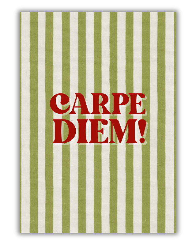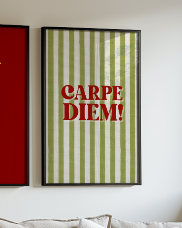 Start every day with a dose of inspiration thanks to this powerful “Carpe Diem!” quote print. The burgundy lettering stands out against a chic green and white striped background, creating a playful yet timeless piece of motivational wall art. Perfect for adding a mid-century modern or retro flair to your home office, bedroom, or entryway, this poster encourages you to seize the day. It’s a versatile piece of inspirational decor that looks fantastic in any space.