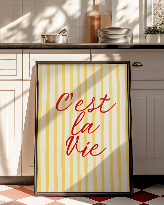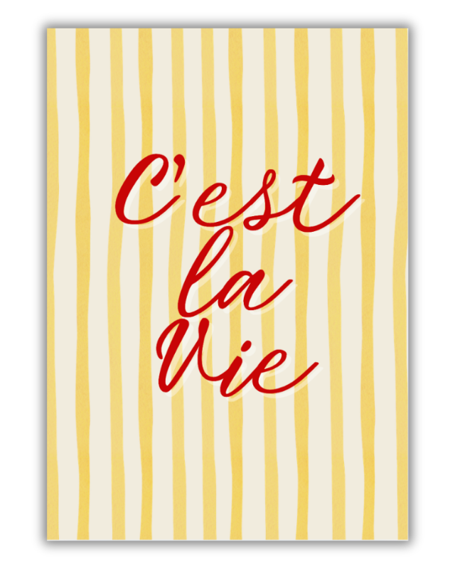 Featuring the beloved phrase “C’est la Vie” in a vibrant, flowing red script over a cheerful yellow and cream striped background, this poster brings a touch of retro French charm to any room.