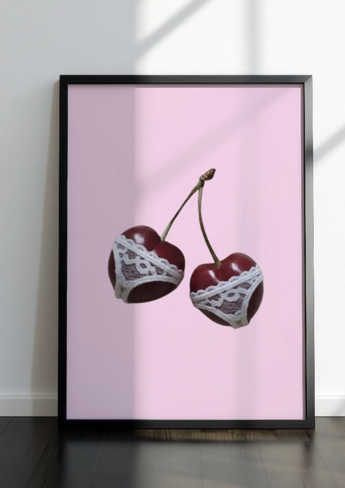 Add a touch of playful subversion to your walls with this Cherry Lingerie Art Print. Featuring two ripe, deep-red cherries “wearing” delicate white lace lingerie against a soft pastel pink background, this piece is the ultimate statement for lovers of coquette aesthetic, maximalist decor, and modern surrealism.