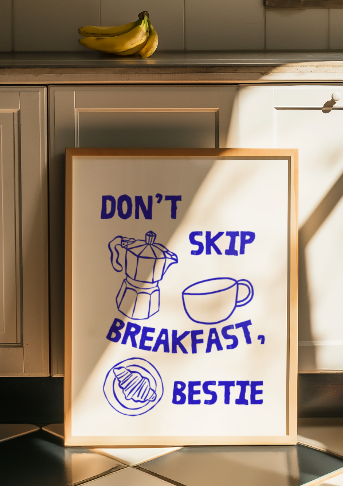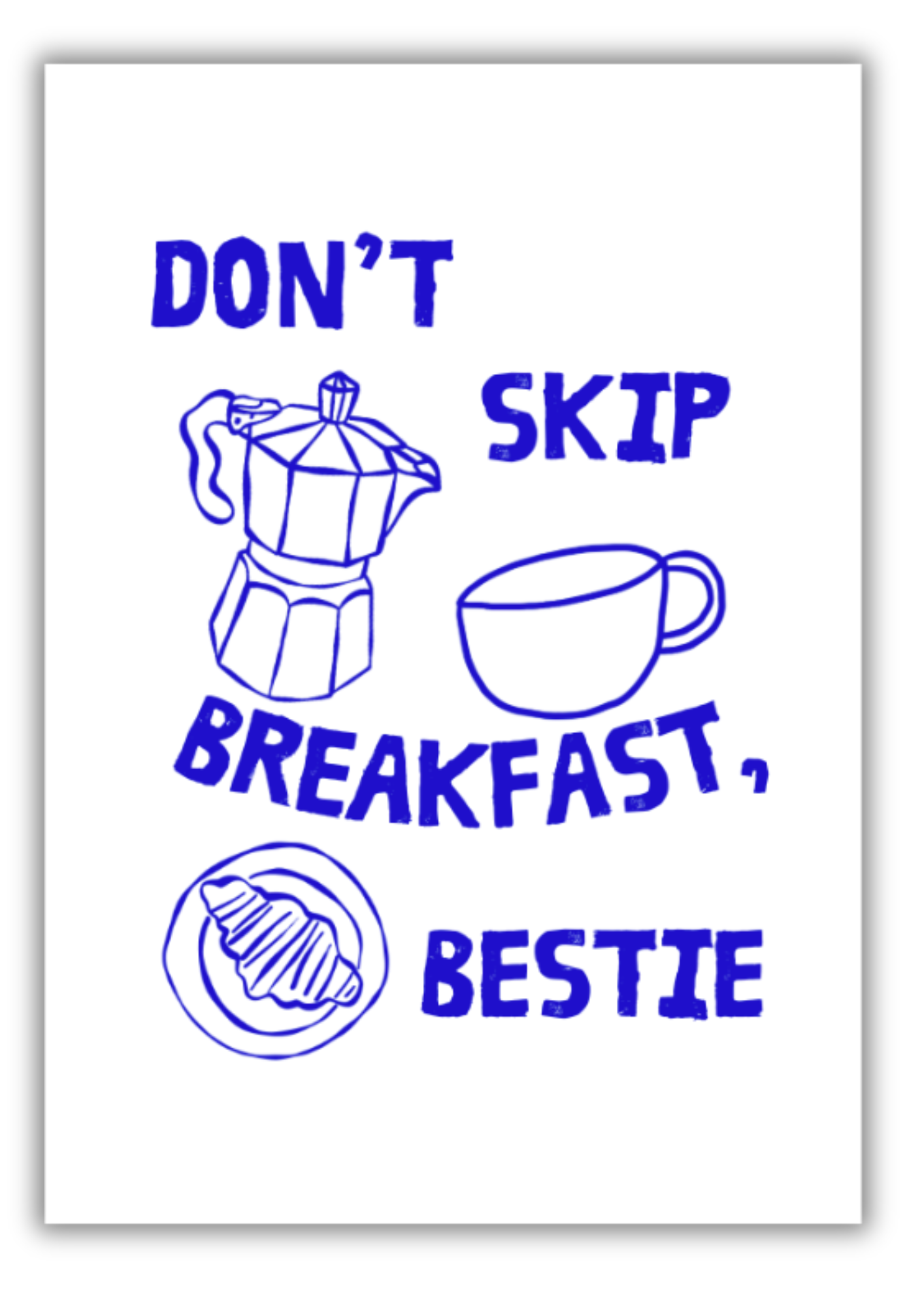 Transform your kitchen or coffee station with this charming and motivational “Don’t Skip Breakfast, Bestie” Art Print. This unique, high-quality print features a delightful, hand-drawn style illustration in a deep indigo blue hue, perfect for adding a pop of personality to your decor.