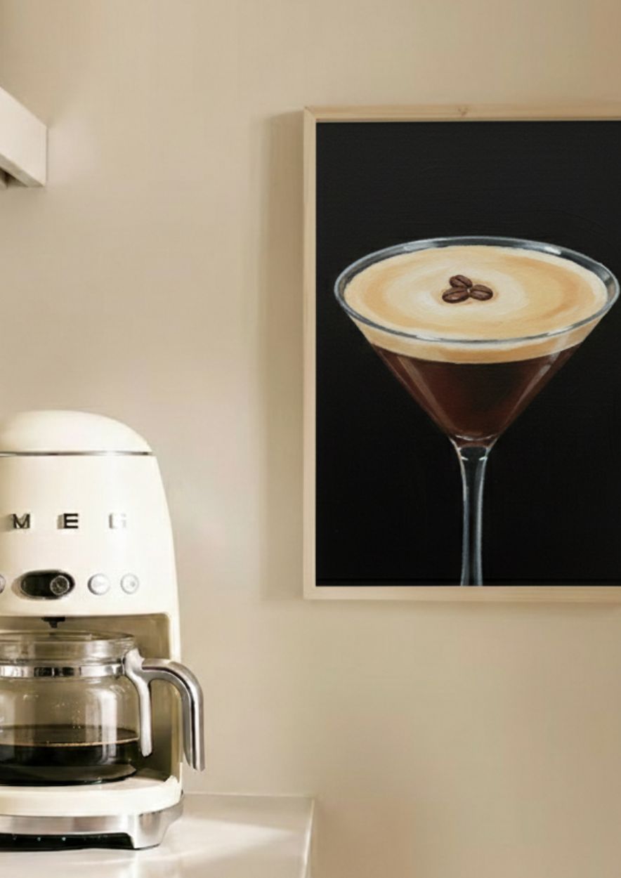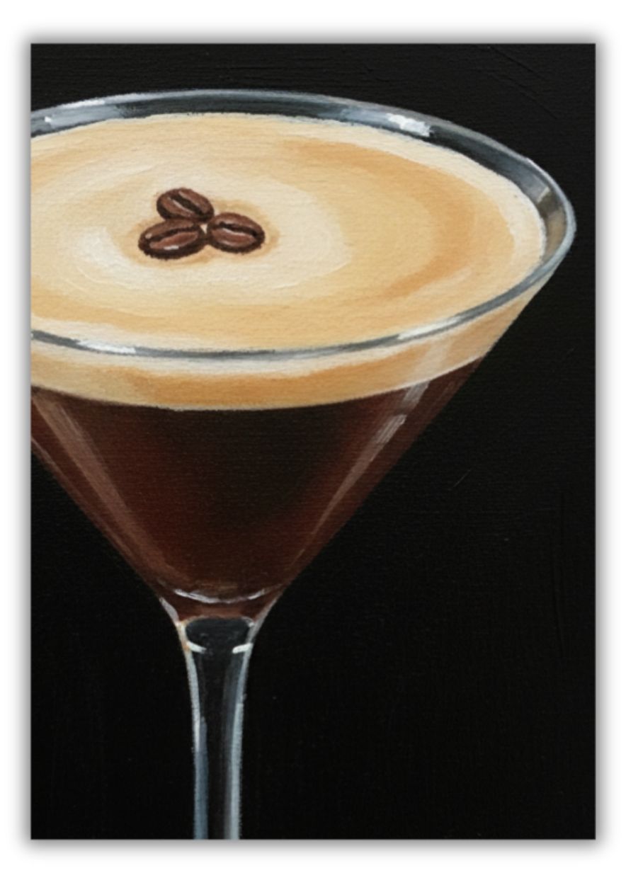 Transform your space with this sophisticated Espresso Martini art print, a perfect blend of classic mixology and modern artistic flair. This high-quality reproduction captures the rich, velvety textures of a freshly poured espresso martini, complete with its signature frothy foam and the iconic trio of coffee beans. Originally rendered in a painterly acrylic style, the visible brushstrokes add a layer of depth and authenticity that makes this piece stand out against a dramatic, moody black background.