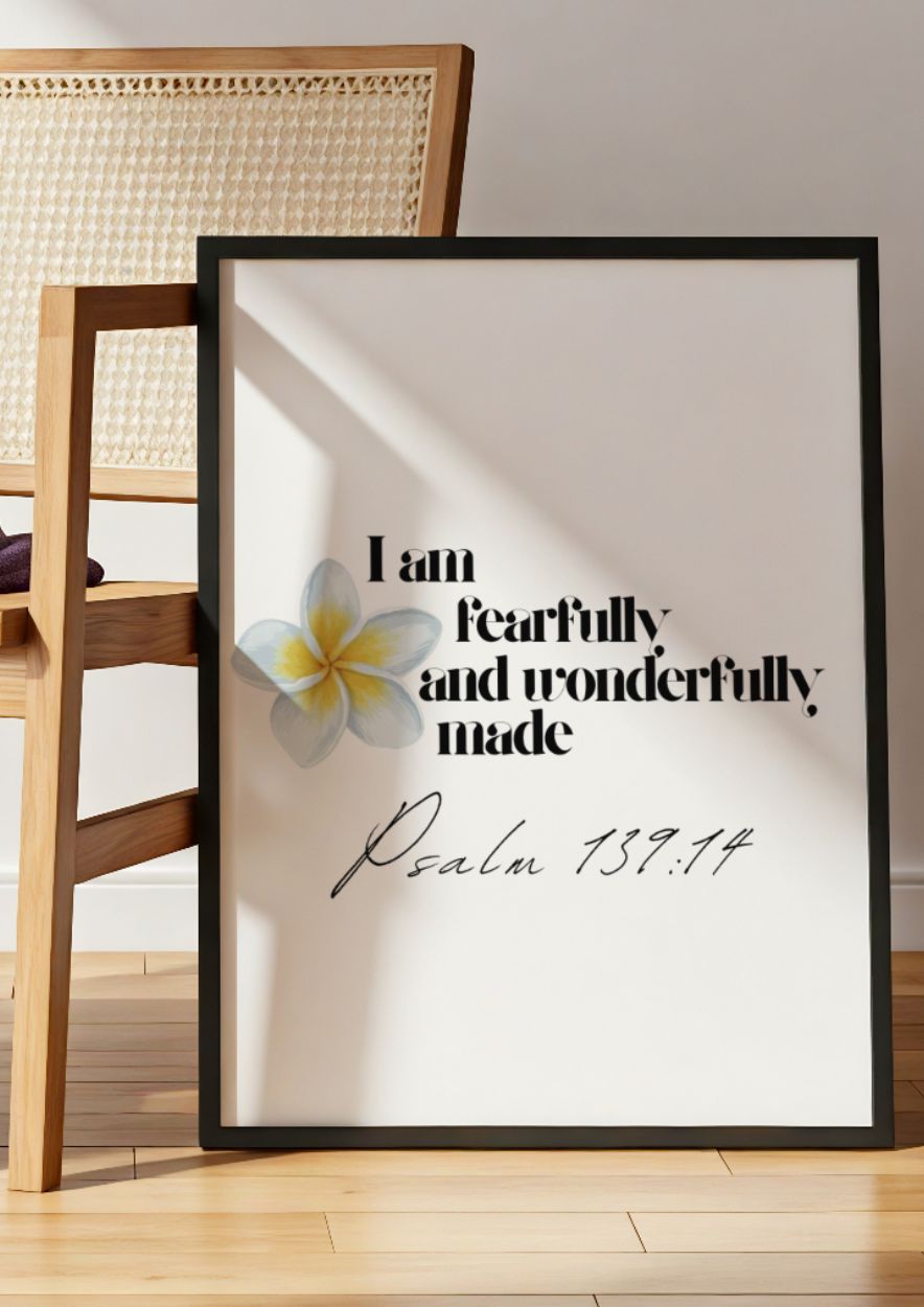 Bring a sense of peace and divine affirmation into your home with this beautiful Psalm 139:14 wall art. Featuring the powerful scripture, “I am fearfully and wonderfully made,” this print serves as a daily reminder of worth, purpose, and faith. The design blends modern typography with a delicate, soft-toned frangipani (plumeria) flower, making it a versatile piece for various interior styles.