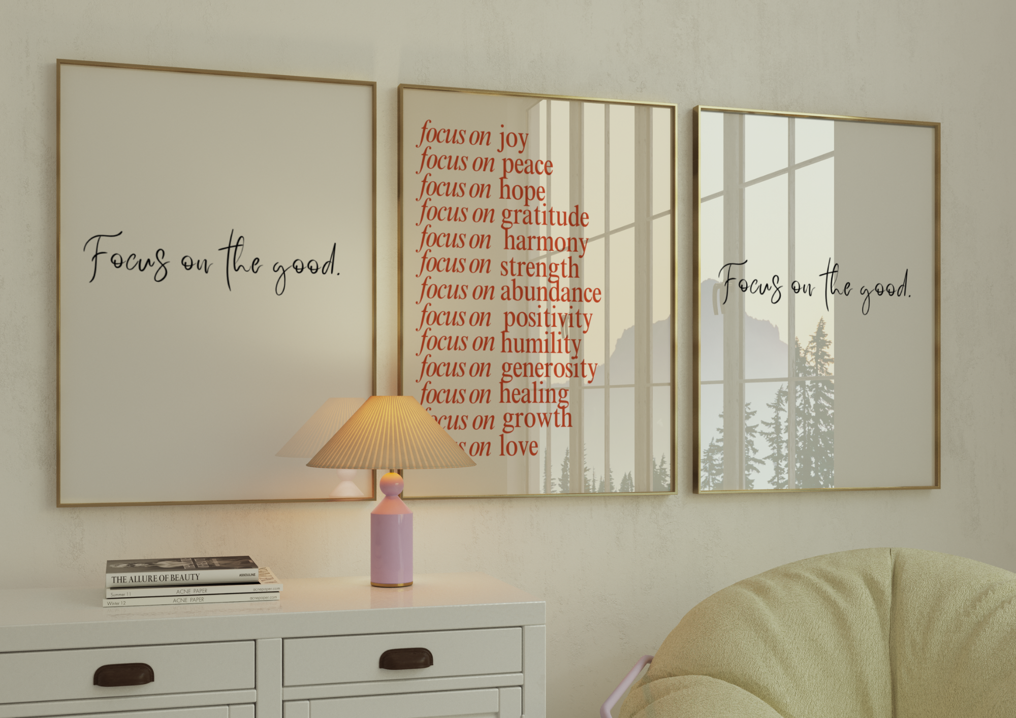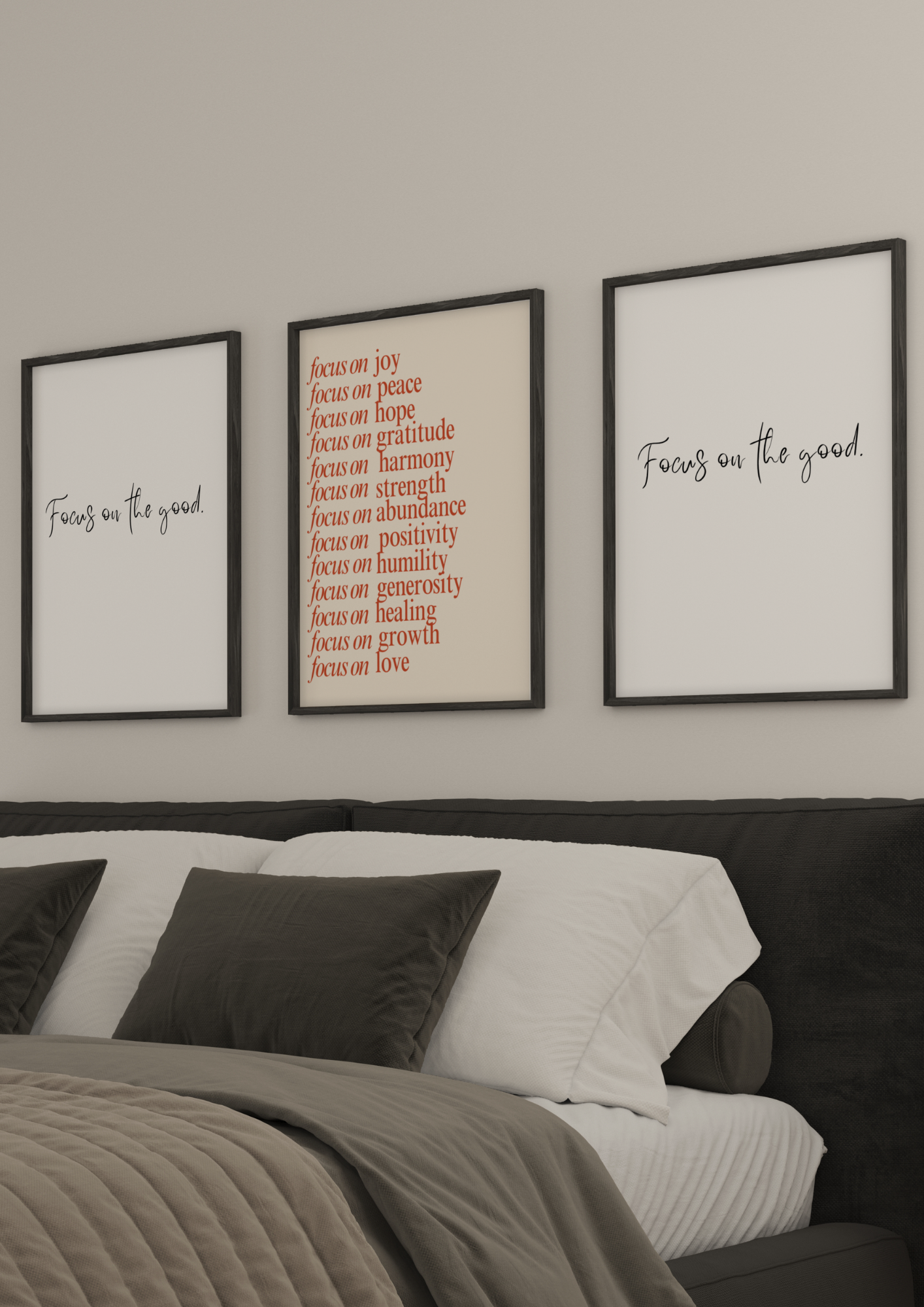 2x Minimalist “Focus on the Good” Prints – Elegant black cursive typography on a white background, perfect for framing on either side of the affirmation print for a balanced and stylish look.