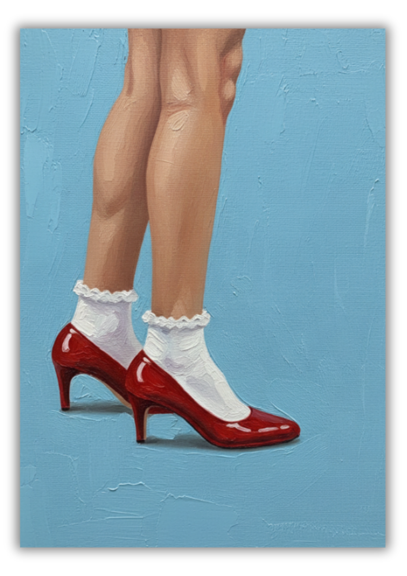 This unique artwork blends a sense of playful nostalgia with sleek, modern aesthetics. The crisp contrast between the fiery red shoes and the cool blue backdrop creates a dynamic visual impact, making it perfect for collectors who appreciate pop art, vintage fashion, or contemporary figurative works. The composition is clean yet provocative, celebrating fashion, color, and form.