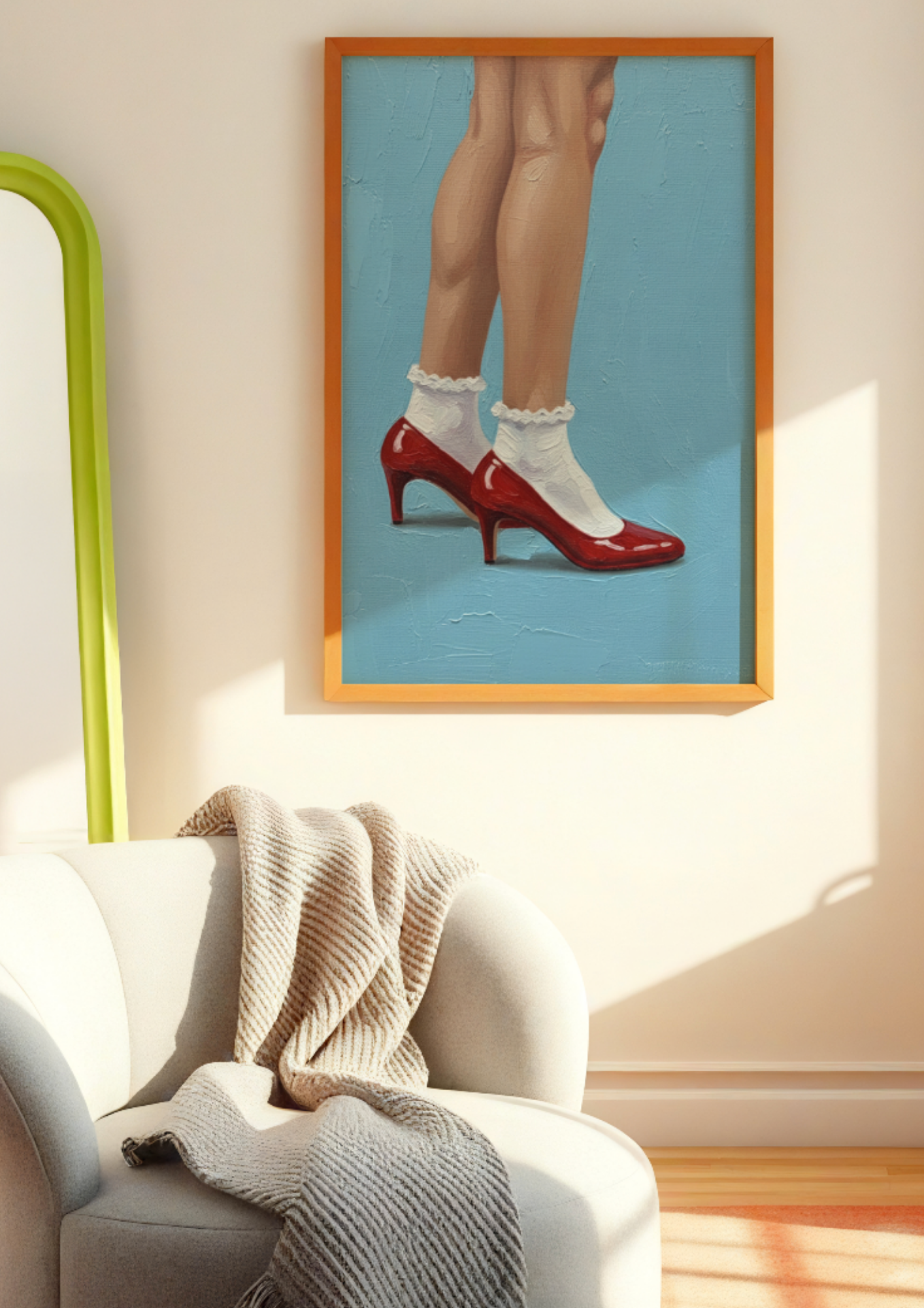 Dive into the world of bold, retro-inspired art with this striking print featuring a captivating close-up of feminine legs adorned with vibrant red leather high heels and delicate, frilly white ankle socks. Set against a mesmerizing, textured sky blue background, this piece immediately grabs attention and serves as a powerful focal point in any room.