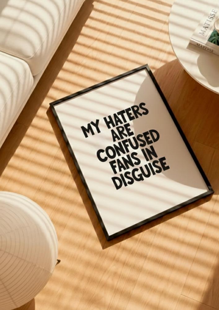 Step into your power with this fierce “My Haters Are Confused Fans In Disguise” motivational quote print, crafted exclusively for the it girls and baddies who know exactly who they are! This bold, unapologetic affirmation poster screams confidence, turning shade into fuel and reminding you that every hater is secretly your biggest fan in disguise. Perfect for the modern boss babe, this empowering wall art brings that baddie energy, it girl vibe, and rich girl aesthetic straight to your space—whether it’s your bedroom glow-up corner, vanity setup, glam room, or home office where you manifest success.