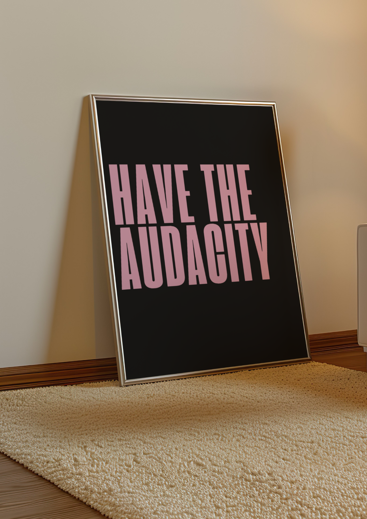 Make a fearless statement with the “Have the Audacity” poster. Featuring bold pink typography on a sleek black background, this empowering art piece inspires confidence, ambition, and unapologetic boldness. Designed to stand out, it’s the perfect addition to modern interiors, from bedrooms to home offices or creative spaces.