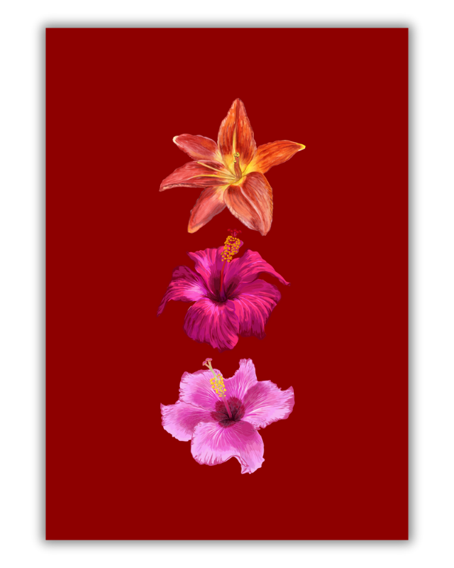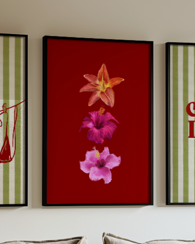 Elevate your décor with this striking tropical flower art print that commands attention. Featuring a trio of richly painted blossom:s a fiery orange lily and two beautiful pink hibiscus flowers, this botanical wall art captures the luxurious colors of nature. The vibrant florals pop against a dramatic deep burgundy background, making this piece a stunning addition to any room needing a bold maximalist or glamour touch. This unique vertical floral poster brings a sophisticated, year-round bloom to your home.