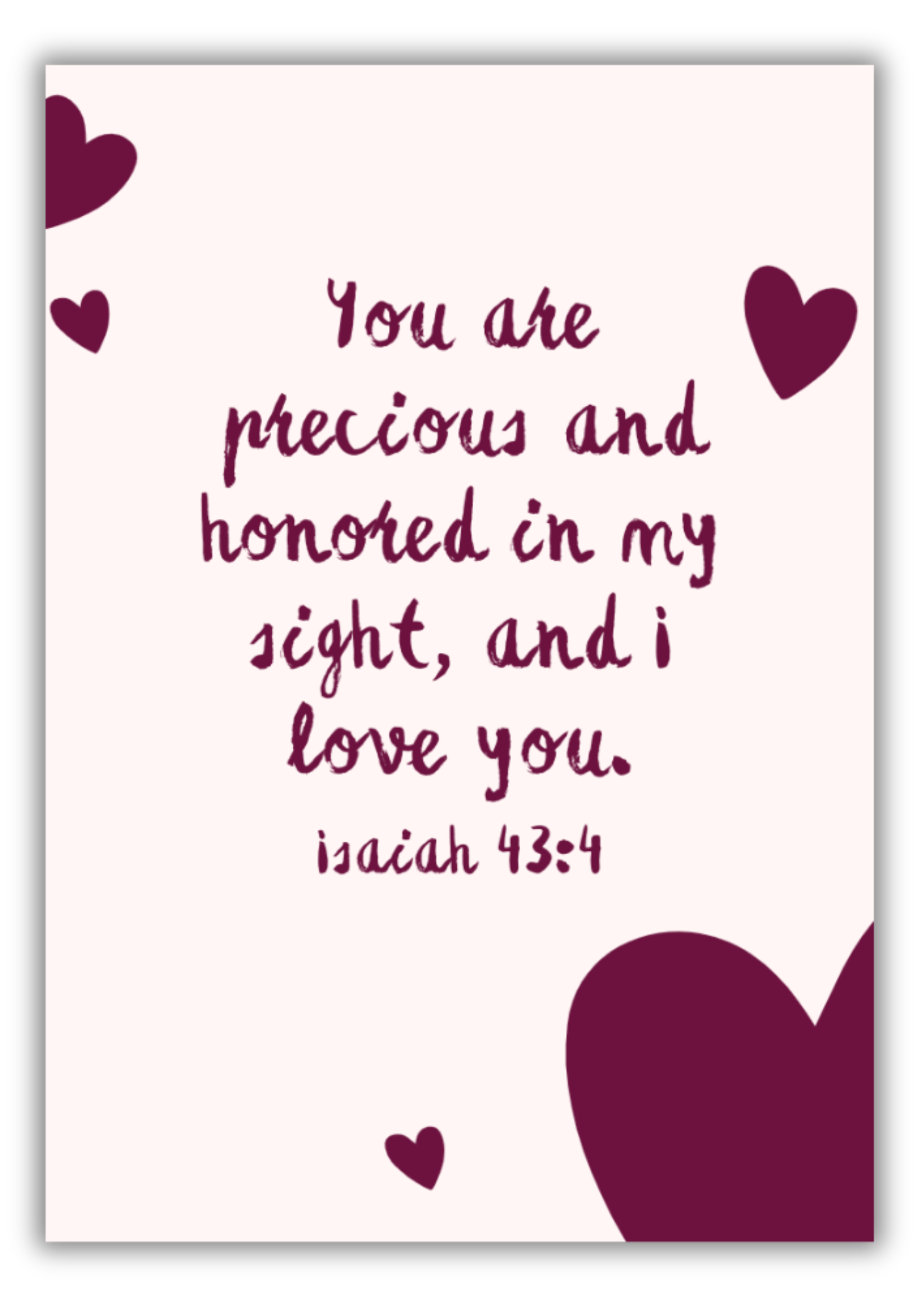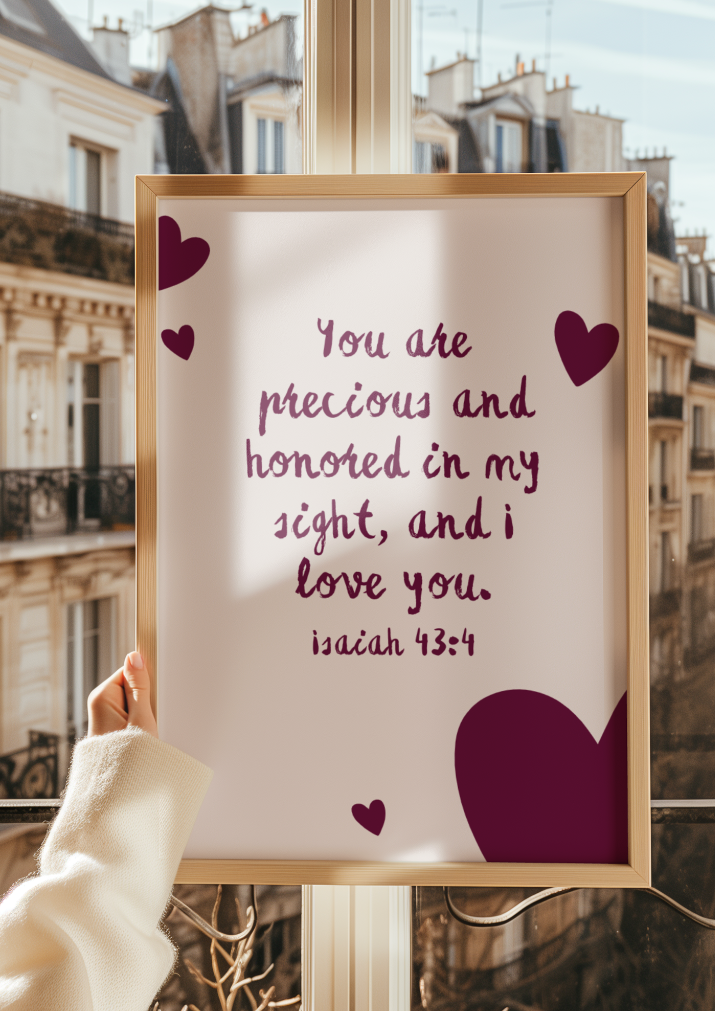 Isaiah 43:4 is a powerful reminder of your worth and God’s unwavering love. This beautifully designed art print features the heartfelt verse, “You are precious and honored in my sight, and I love you”, in elegant typography on a clean and minimalist background. Perfect for those seeking to add a spiritual touch to their home or office, this print is a daily source of inspiration and faith.