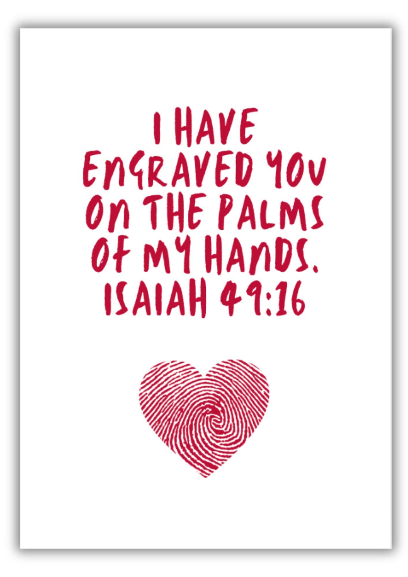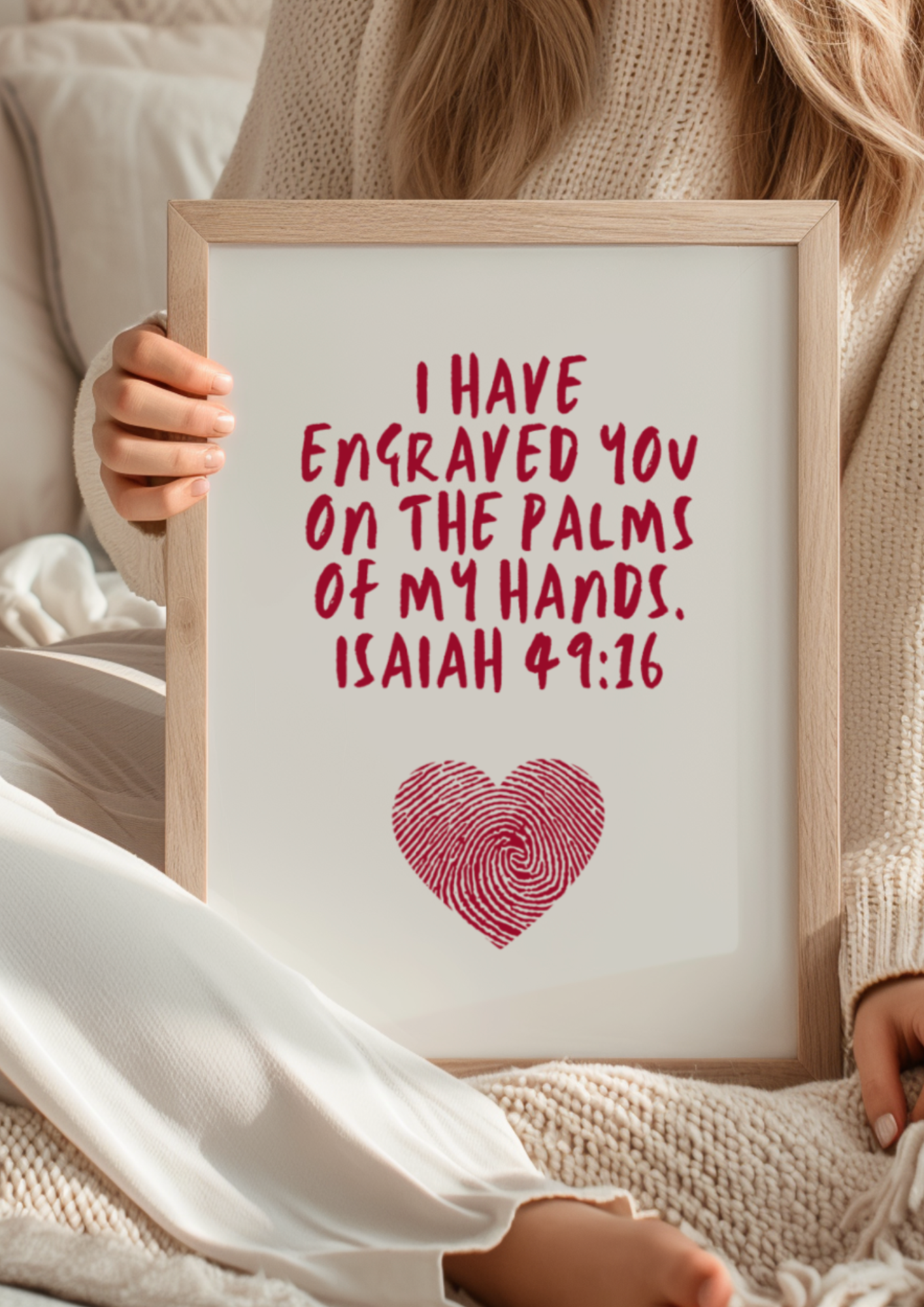 Celebrate God’s everlasting love and care with this Isaiah 49:16 art print, featuring a unique fingerprint heart design. The verse, “I have engraved you on the palms of my hands,” is a powerful reminder of God’s intimate connection with His children and His unwavering devotion.