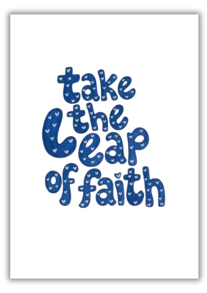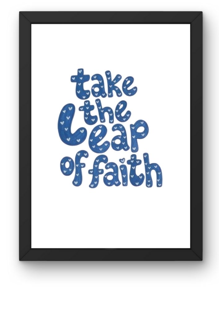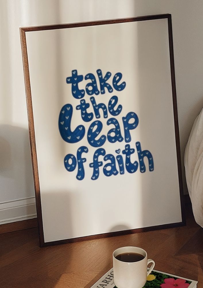 Transform your living space or workspace with this vibrant Take the Leap of Faith typographic art print. Featuring bold, hand-lettered style blue “bubble” font with delicate white heart patterns inside the letters, this piece serves as a daily reminder to embrace courage and new beginnings.