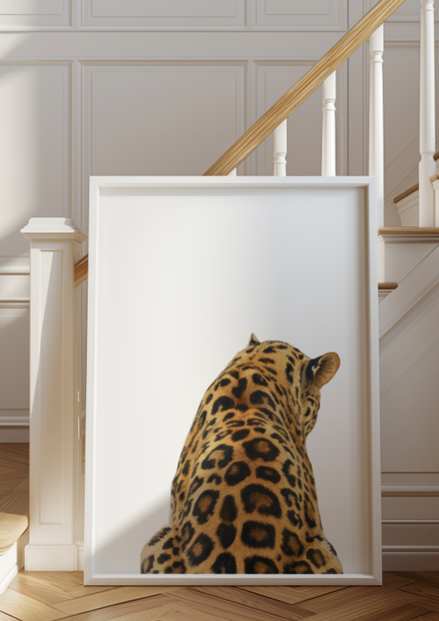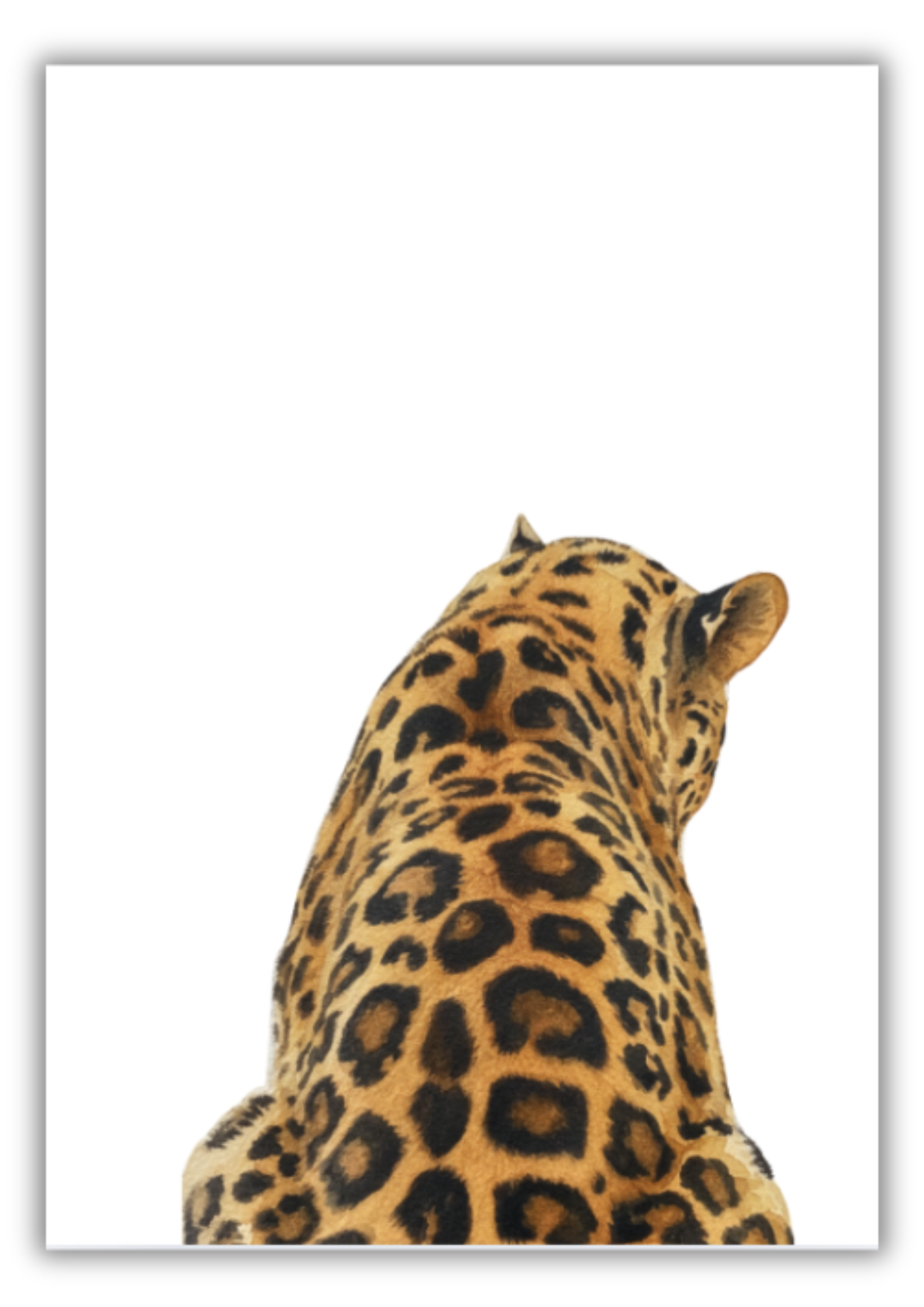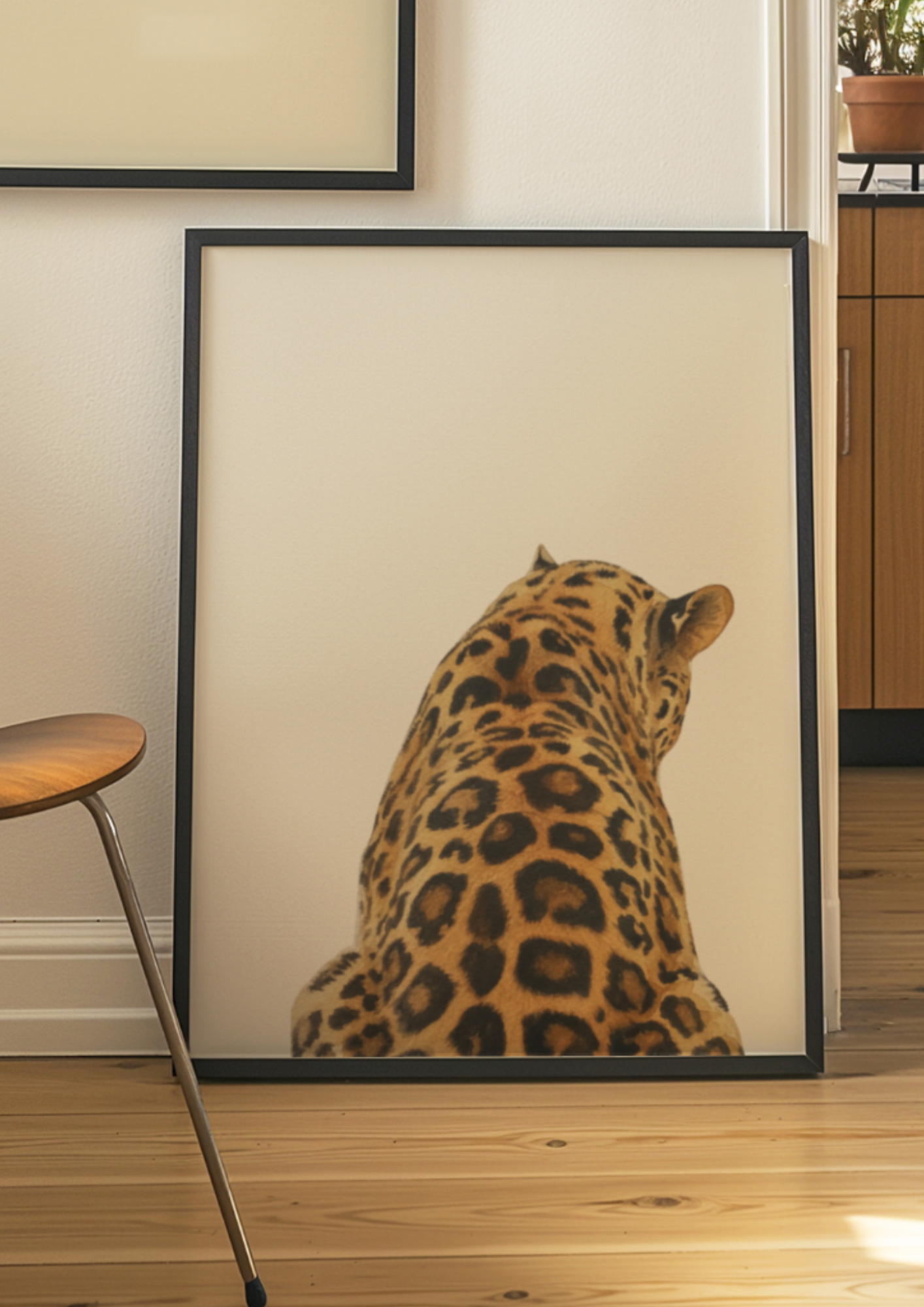 The print features a close-up, dramatic view of the leopard’s back, showcasing the perfect musculature and the rich, complex design of its characteristic rosettes. The animal is turned away, inviting a sense of intrigue and quiet power into the space. The vibrant, warm tones of the fur—golden-browns and deep blacks—are perfectly isolated against the clean, light background, creating a bold, contemporary aesthetic. This piece adds profound visual interest and a sophisticated, nature-inspired touch to any interior. It is an exceptional choice for a modern home, a stylish study, or any space where you desire a focal point that conveys strength and mystery.