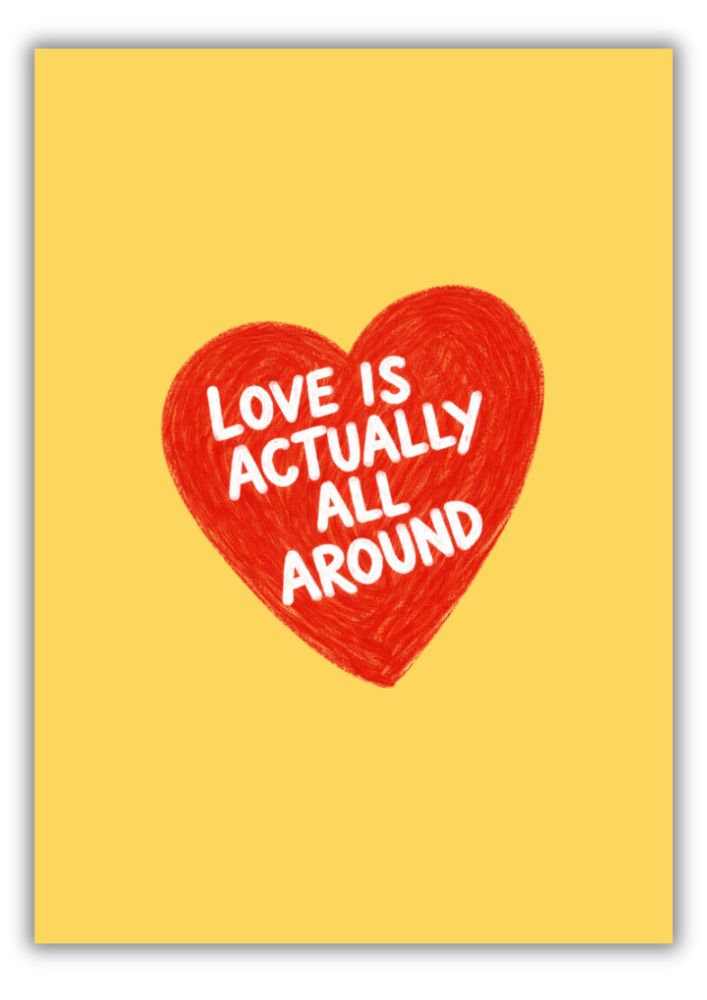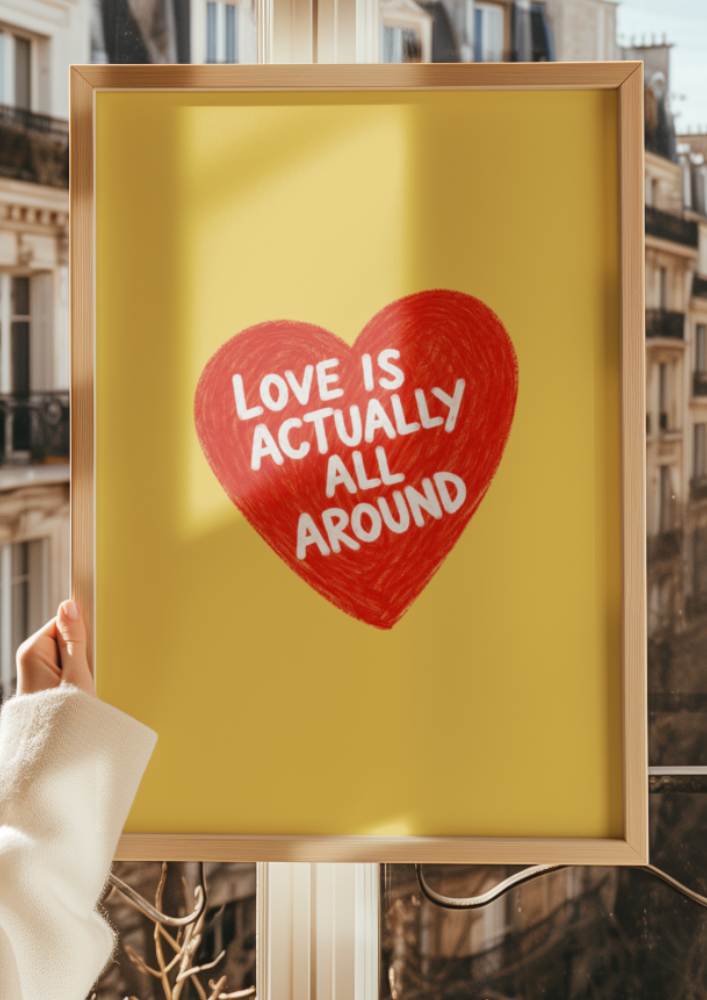 Bring a touch of warmth and optimism to your home with our Love Is Actually All Around art print. This vibrant piece of modern wall decor features a bold, hand-drawn red heart set against a striking mustard yellow background. The playful white typography delivers a timeless message inspired by classic romantic sentiments, making it an ideal addition to any contemporary living space.