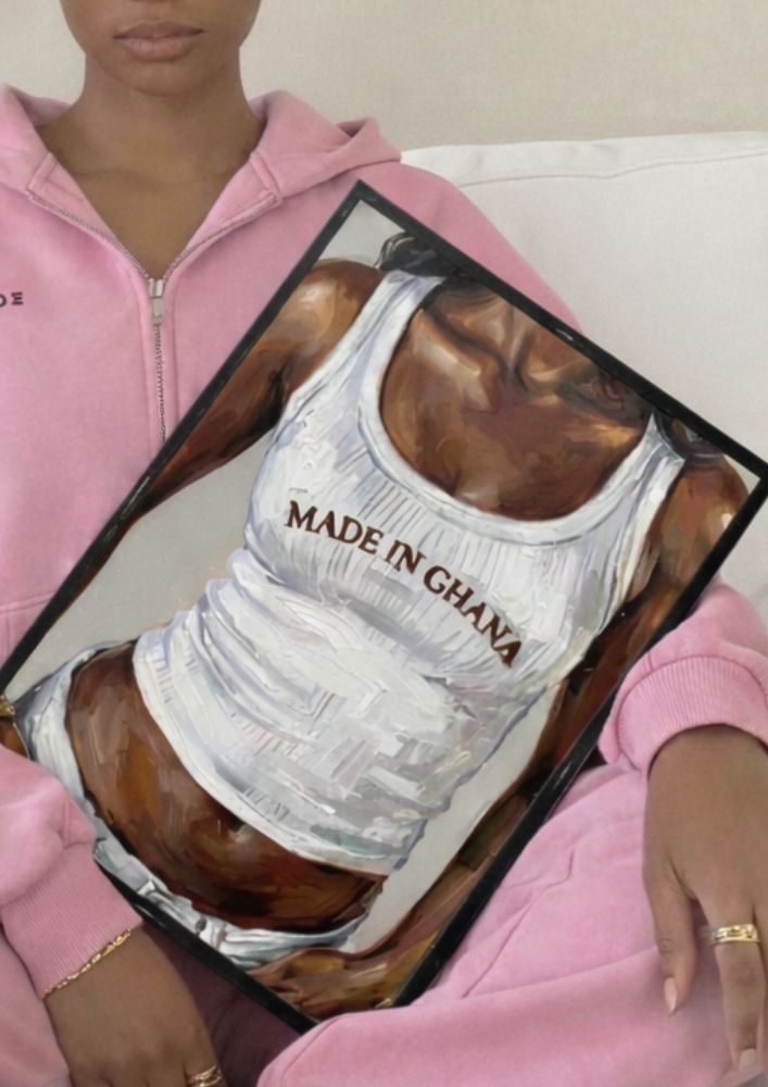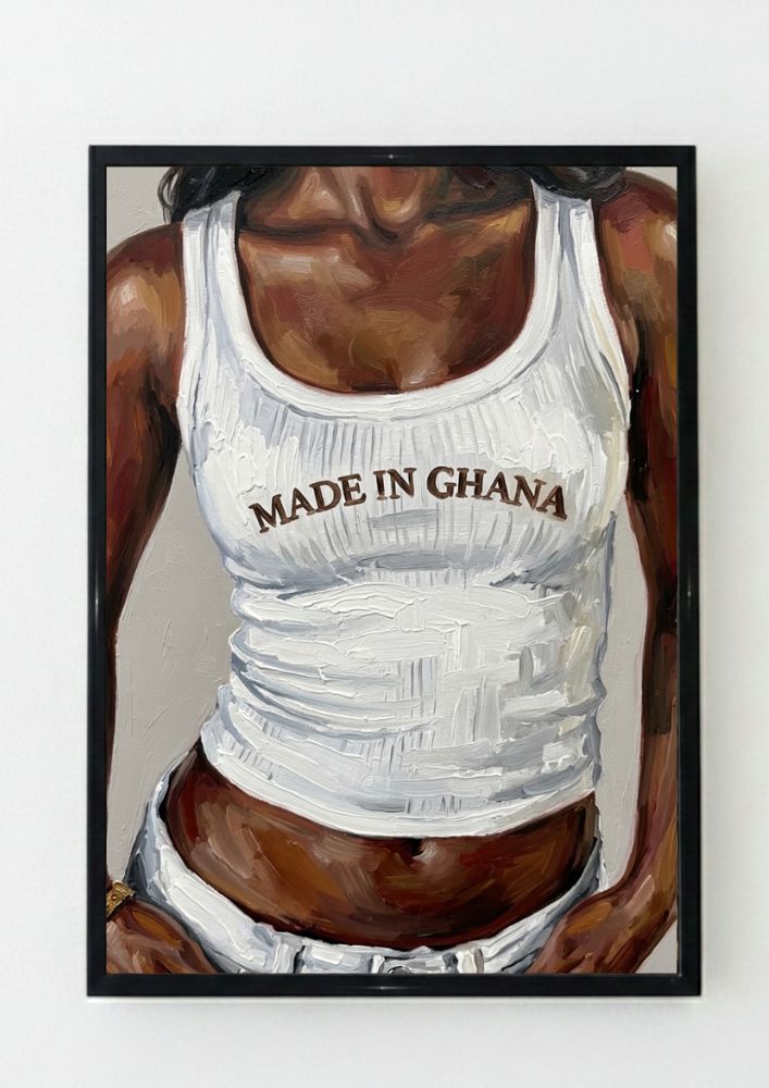 Elevate your home decor with this stunning “Made in Ghana” art print, a high-quality original oil painting that celebrates Ghanaian heritage and cultural pride. This captivating artwork features a close-up portrait of an woman wearing a crisp white tank top emblazoned with the bold “Made in Ghana” text in earthy brown tones, symbolizing strength, identity, and national pride. Rendered in rich, textured brushstrokes, this print captures the essence of contemporary African art, blending realism with expressive artistry to highlight the beauty of dark skin tones, subtle lighting, and intricate fabric details.