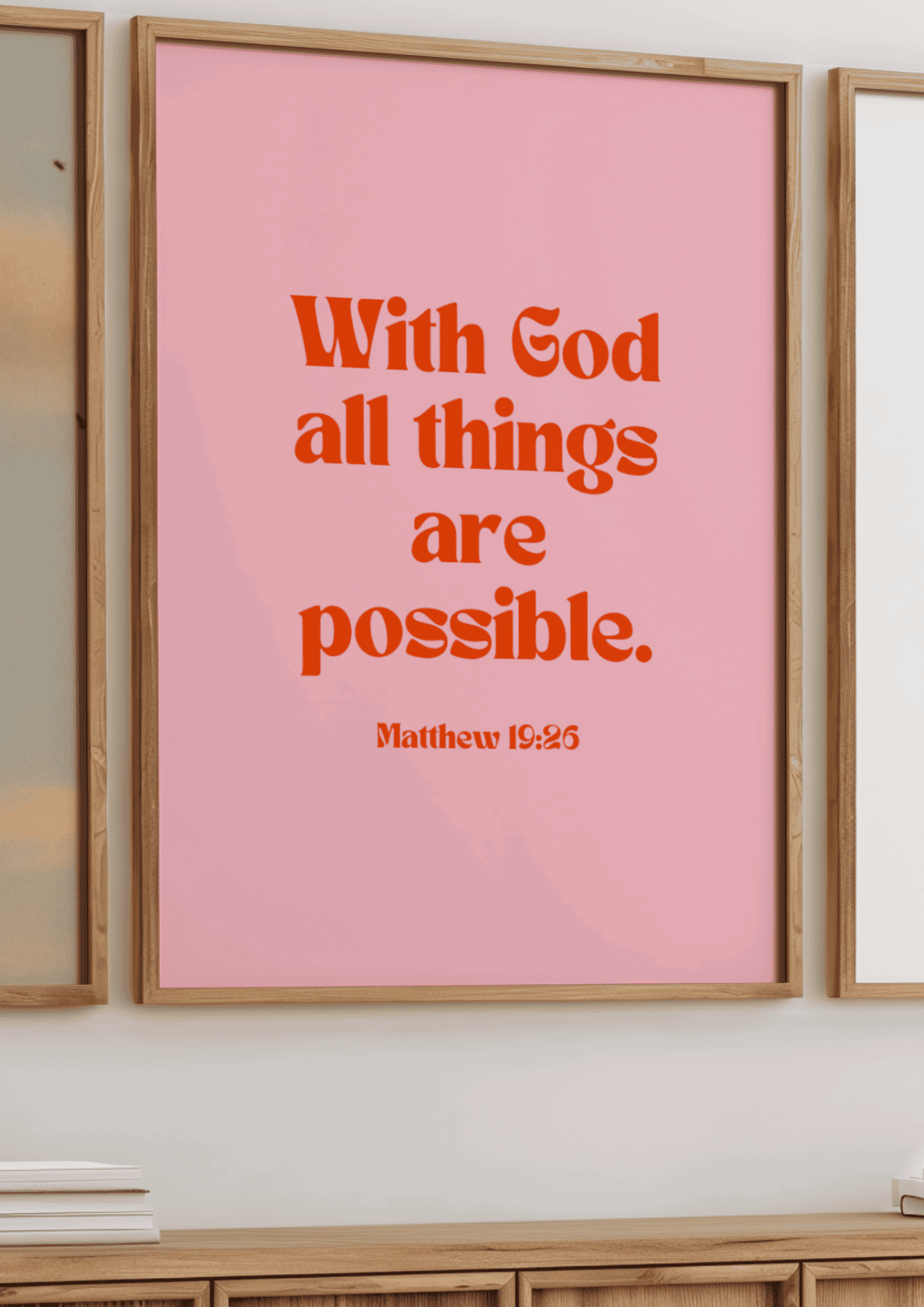Matthew 19:26 Art Print – With God All Things Are Possible – Pink Christian Wall Decor