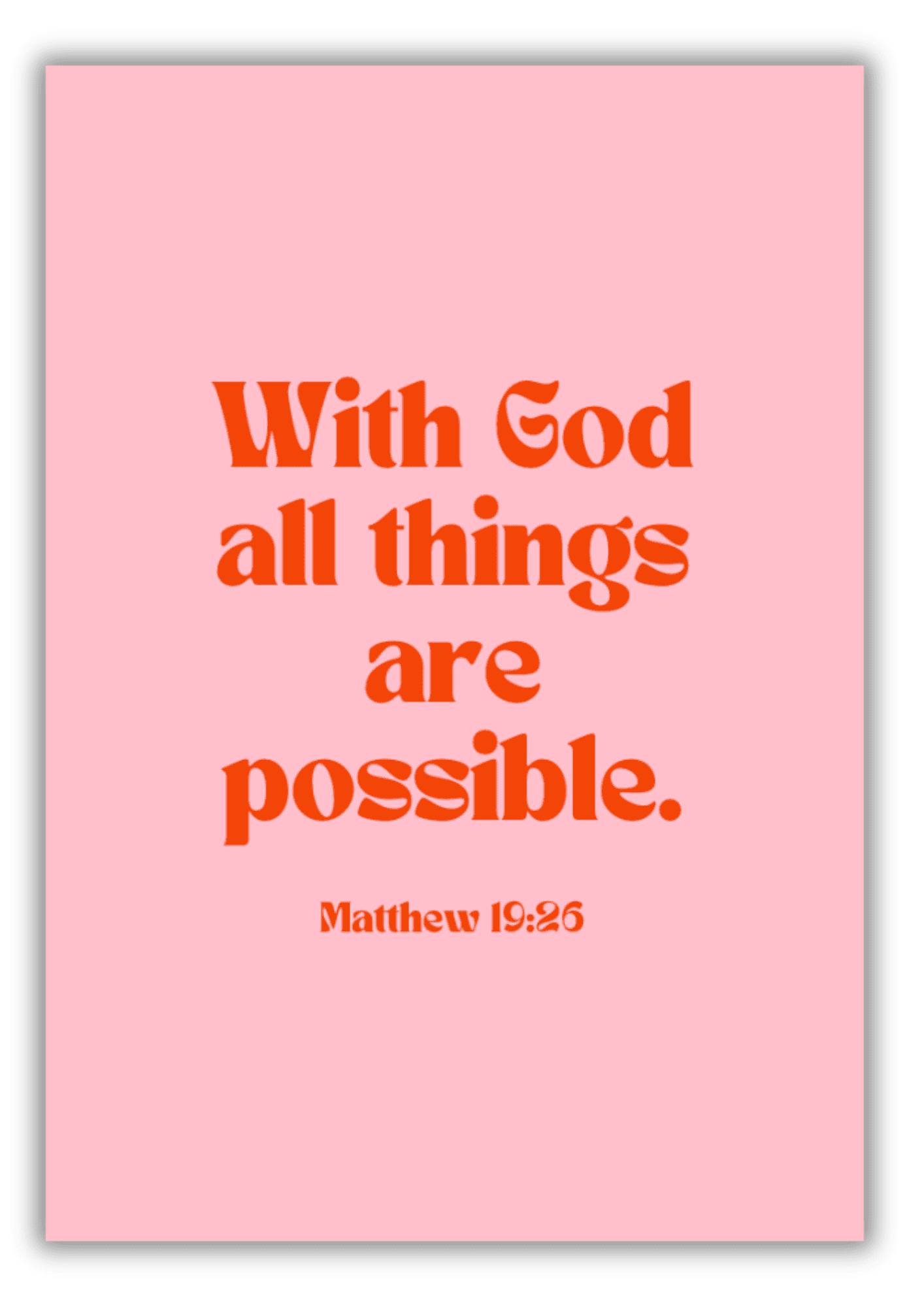 Inspire faith and confidence with this beautiful Matthew 19:26 art print, featuring the empowering scripture: “With God, all things are possible,” set against a soft pink background. This uplifting design is perfect for creating a warm and hopeful atmosphere in your home or workspace.