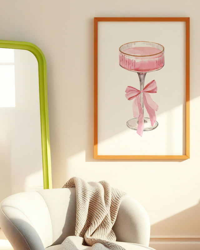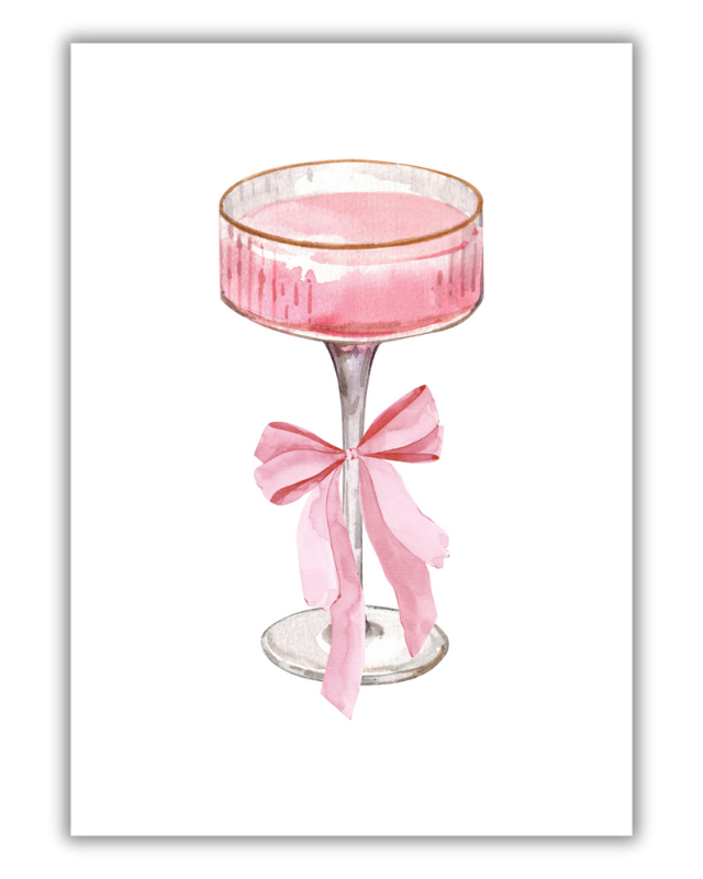 This print is perfect for those who love the coquette aesthetic, feminine wall art, or anyone looking to add a stylish accent to their kitchen, dressing room, or home bar. It makes a beautiful, playful statement and is an ideal choice for enhancing a gallery wall with a soft, celebratory feel. Bring a little pink elegance to your home with this delightful cocktail illustration.