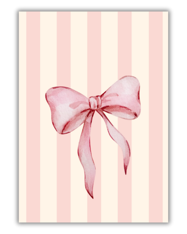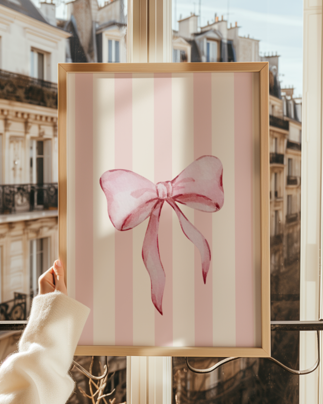 Introduce a touch of timeless feminine elegance to your living space with this beautiful art print. This classic design features a soft, hand painted pink ribbon set against a delicate striped background in soothing pastel tones. It is a stunning piece of chic decor that adds a sophisticated, gentle charm to any bedroom, dressing room, or cozy reading nook. The delicate details of the watercolor bow bring texture and a sweet, nostalgic feeling to your walls. This pastel pink poster is an effortless way to enhance your interior design with a lovely, high quality focal point.