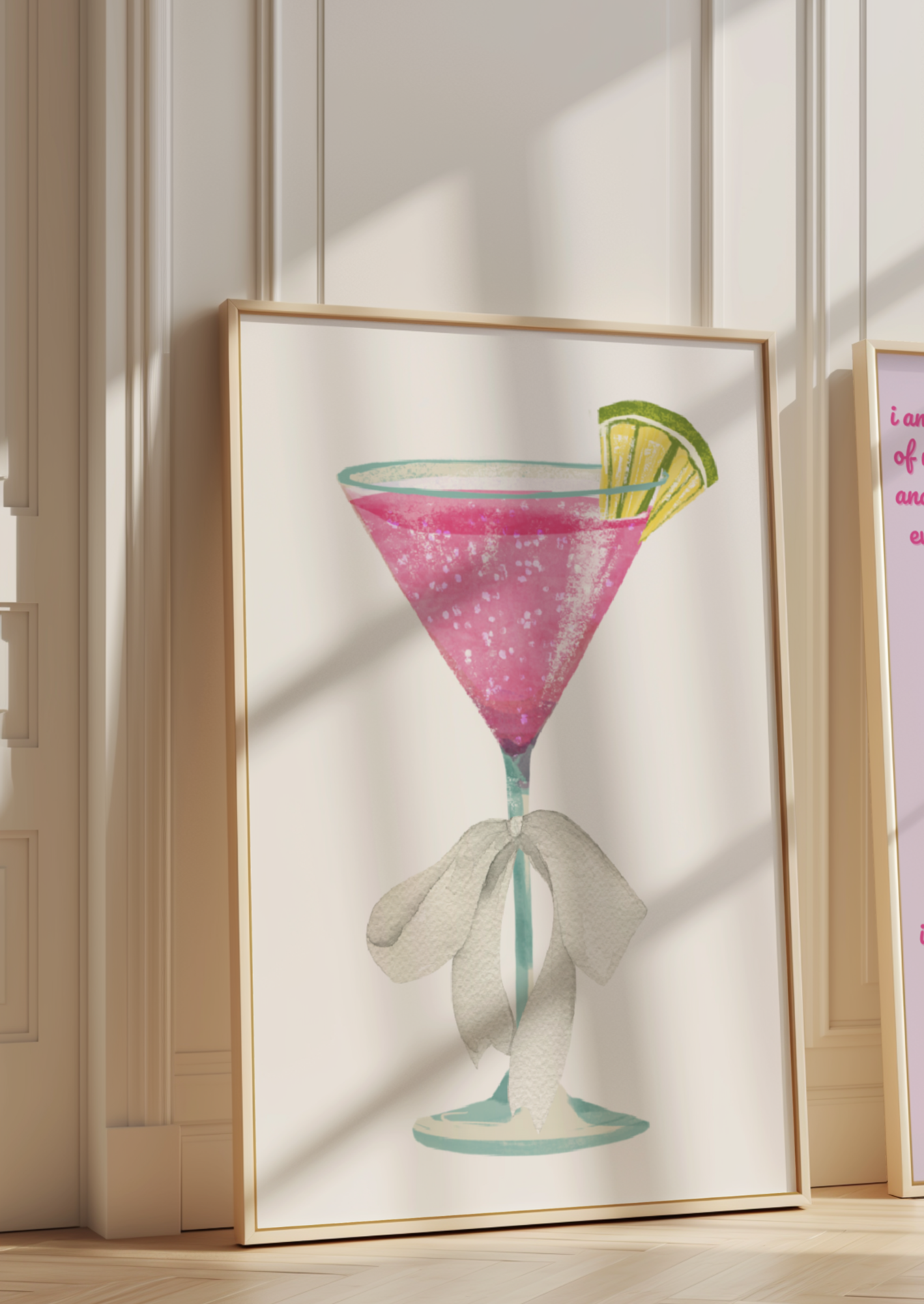 Framed pink cocktail art print displayed in a stylish home setting.Pink Cocktail Ribbon Art Print