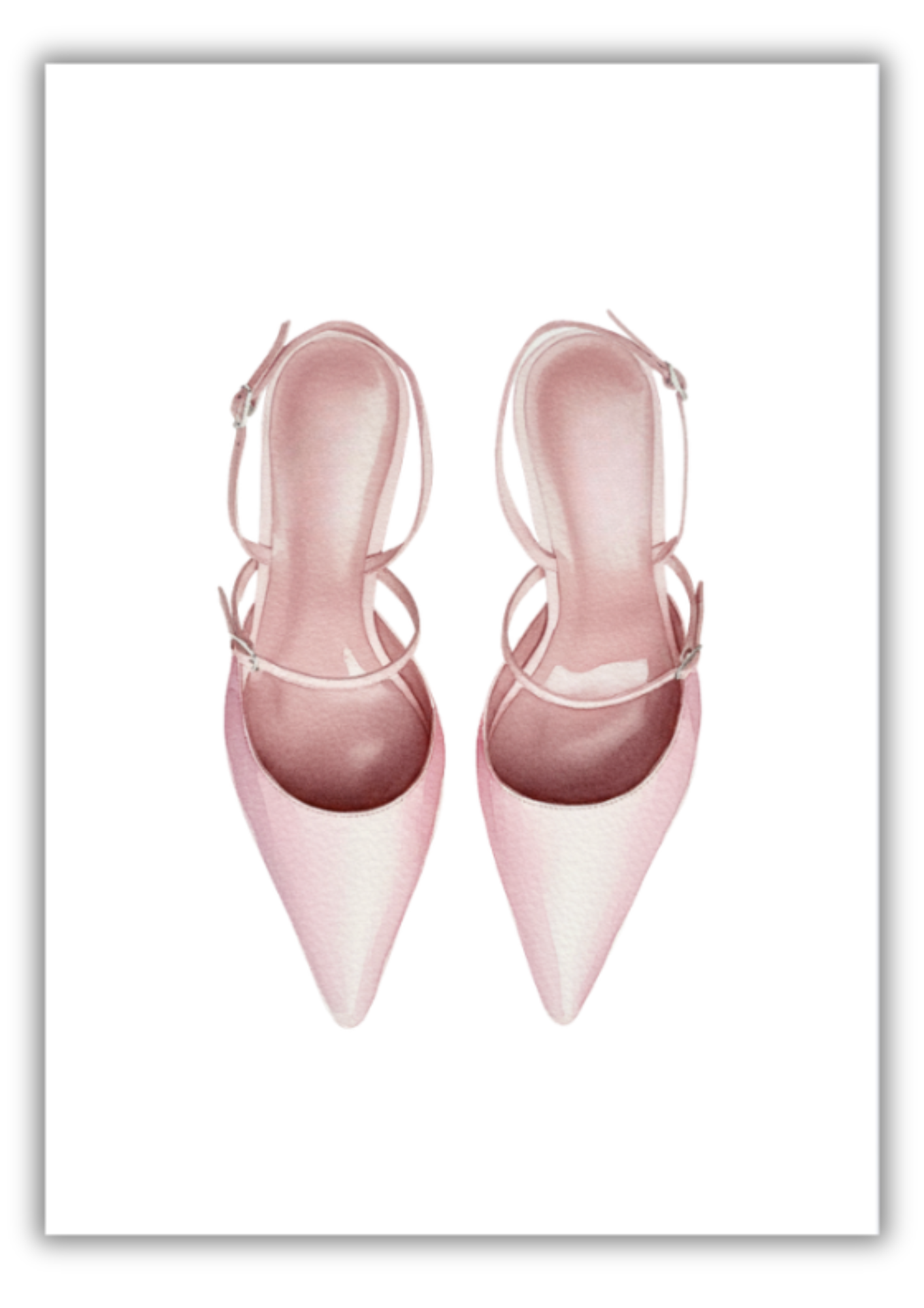 Bring a touch of high fashion and timeless elegance into your home with this stunning watercolor print featuring a pair of blush pink, pointed-toe slingback high heels. This quality poster captures the delicate artistry of hand-painted watercolor, giving the image a soft, sophisticated, and dreamy quality.
