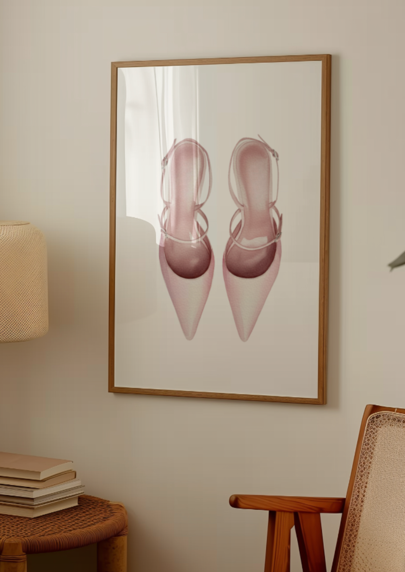 The subtle, muted tones of the pink shoes against a clean white background make this piece an incredibly versatile addition to any modern, minimalist, Scandinavian, or chic interior design scheme. Whether you’re decorating a bedroom, dressing room, walk-in closet, home office, or a stylish living room, this fashion illustration serves as a powerful yet understated focal point.