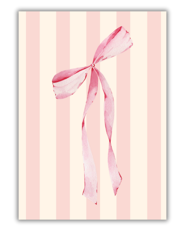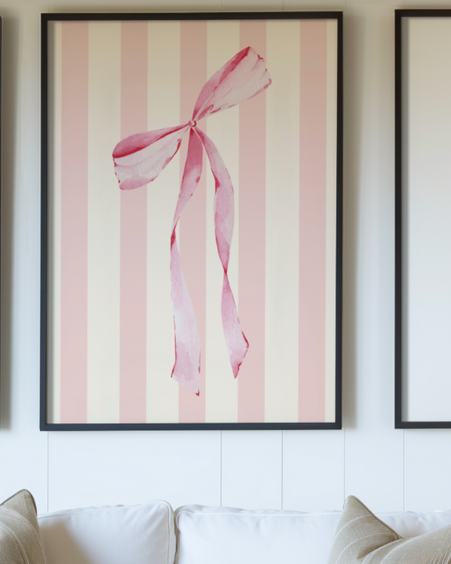 Capture the delicate charm of the coquette aesthetic with this beautiful pink ribbon art print. A soft watercolor bow in varying shades of pink floats elegantly against a sweet, striped background, evoking vintage glamour and effortless femininity. This piece is the perfect sophisticated accent for your girly chic bedroom decor or dressing room. It is an essential item for creating a serene feminine gallery wall and adding a romantic touch to your modern home.