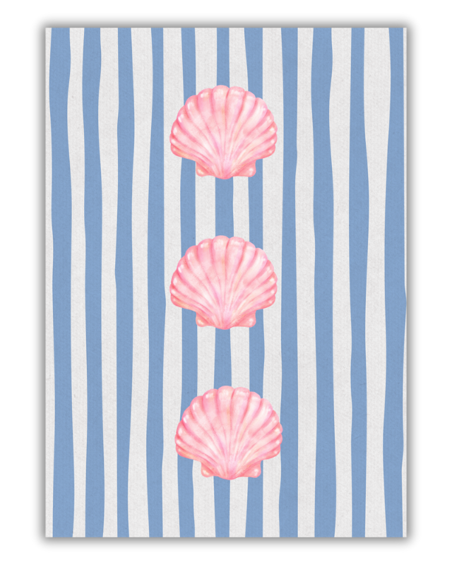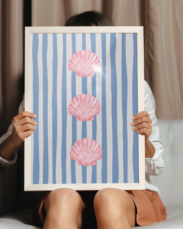 Bring serene coastal vibes into your home with this delightful pink seashells art print. Three beautifully rendered scallop shells in soft pink hues are perfectly aligned against a classic blue and white striped background, evoking a fresh, breezy beach house aesthetic. This charming piece is ideal for adding a touch of nautical decor to your bathroom, or a sun-drenched living area. It is a timeless piece of seashell wall art that celebrates the beauty of the ocean with elegant simplicity.