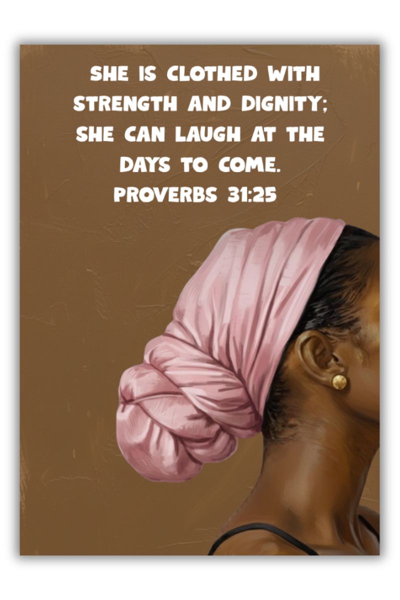 Bring daily inspiration and a touch of modern elegance to your home with this stunning Proverbs 31:25 Scripture Wall Art. Featuring a beautiful, high-quality illustration of a Black woman wearing a vibrant pink headwrap, this print serves as a powerful reminder of resilience, grace, and faith.