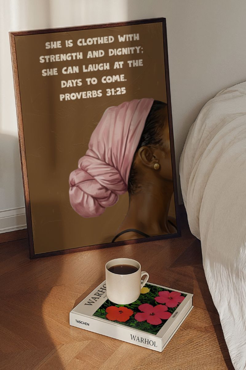 Whether you are looking to create a gallery wall of Black art or need a standalone statement piece that honors Biblical womanhood, this Proverbs 31:25 print is designed to improve the atmosphere of your space and keep you grounded in the Word.
