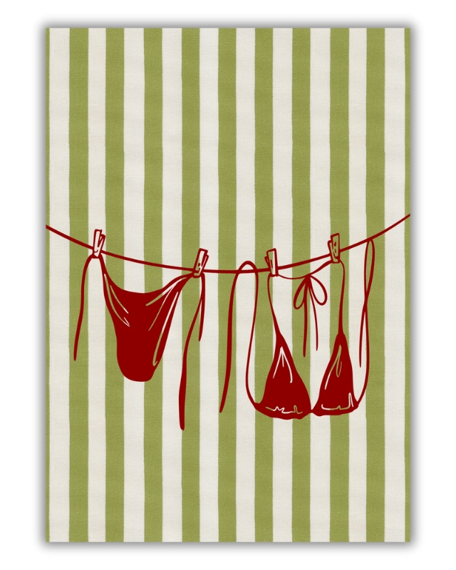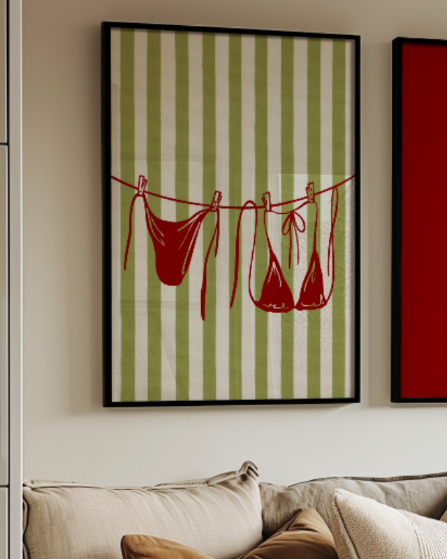 Bring the feeling of a lazy summer day and vintage beach style to your walls with this charming bikini clothesline art print. Featuring a classic burgundy two-piece swimsuit drying on a line against a stylish mid-century modern background of green and white stripes, this piece captures effortless coastal vibes. It’s perfect for adding a pop of color and retro flair to your bathroom, laundry room, or gallery wall. This is a must-have piece of swimsuit wall art for anyone who loves timeless, playful design.