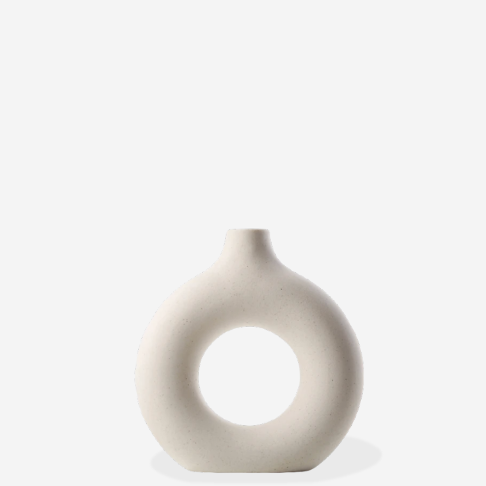 Add a touch of modern elegance to your home with the Serene Mini White Nordic Vase. This circular hollow ceramic vase, inspired by Nordic design, features a unique donut shape that brings a contemporary vibe to any space. Perfect for your living room, bedroom, office, or as a thoughtful gift, this vase effortlessly enhances your interior decor. Whether you fill it with flowers or let it stand alone as a statement piece,