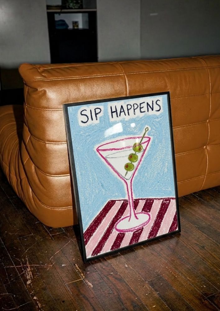 Add a playful and stylish touch to your space with this “Sip Happens” cocktail wall art print – the perfect blend of humor, modern illustration, and trendy bar cart decor. Featuring a vibrant martini glass with olives and bold handwritten typography, this artwork brings a chic yet fun atmosphere to kitchens, home bars, dining rooms, and cocktail corners.