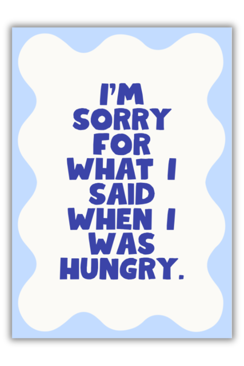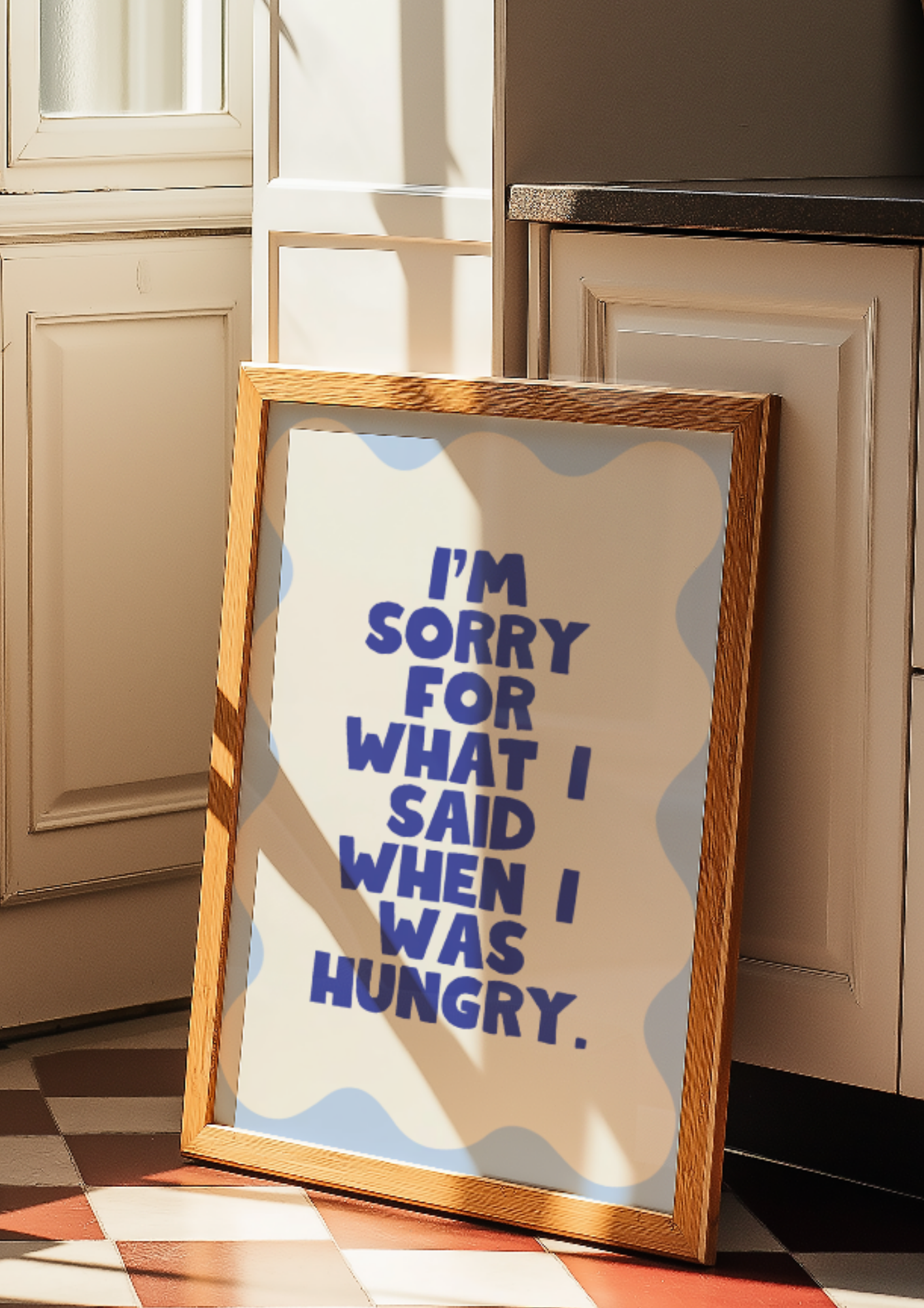 Add a touch of humor and personality to your home with this bold, retro-inspired typography print. Featuring the relatable quote, “I’m Sorry For What I Said When I Was Hungry,” this piece is the perfect conversation starter for your kitchen, dining area, or breakfast nook.
