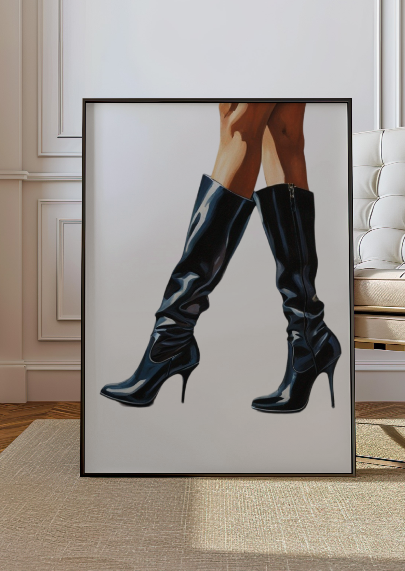 Add a touch of glamour and sophistication to your space with this striking print. This detailed fashion illustration captures the sleek texture and stylish silhouette of stiletto boots, making it a perfect statement piece. Ideal for decorating a dressing room, adding a chic flair to a modern bedroom, or enhancing the vibe of a beauty salon or boutique. The print features deep blacks and rich tones, highlighting the allure of high fashion. Produced as a high-quality print, it ensures exceptional color fidelity and detail.