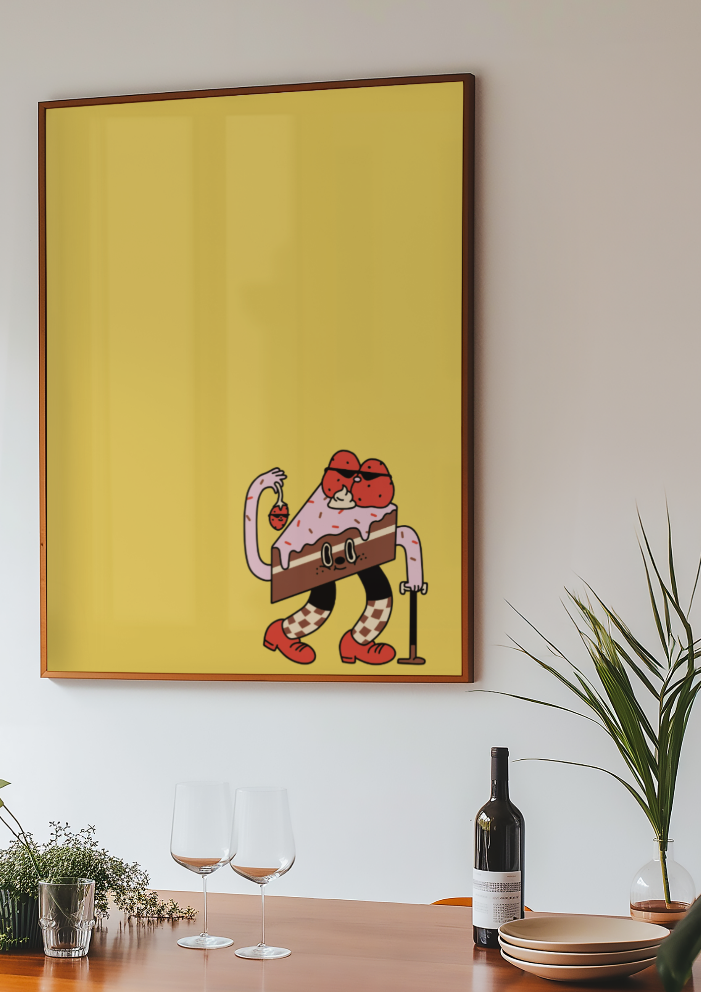 Designed for those who love quirky and bold artwork, this print is a standout piece that pairs beautifully with other colorful, maximalist, and nostalgic decor. Whether you’re a fan of cartoon-style illustrations, dopamine-inducing colors, or unique food-inspired artwork, this funky cake print is guaranteed to make a statement.