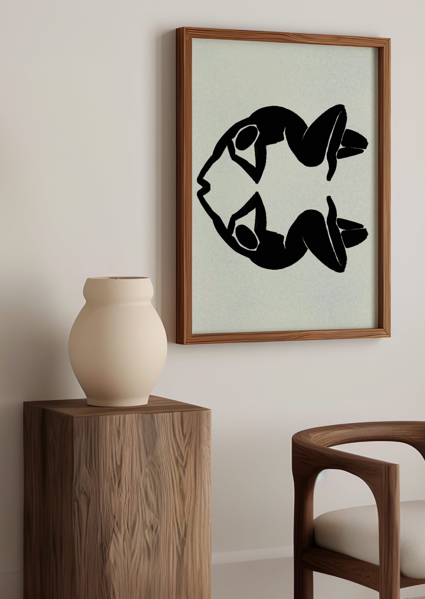 Elevate your space with this captivating abstract art print featuring two elegantly intertwined figures in a dance of balance and harmony. This modern wall art effortlessly captures the beauty of connection and movement, creating a stunning focal point for any room.