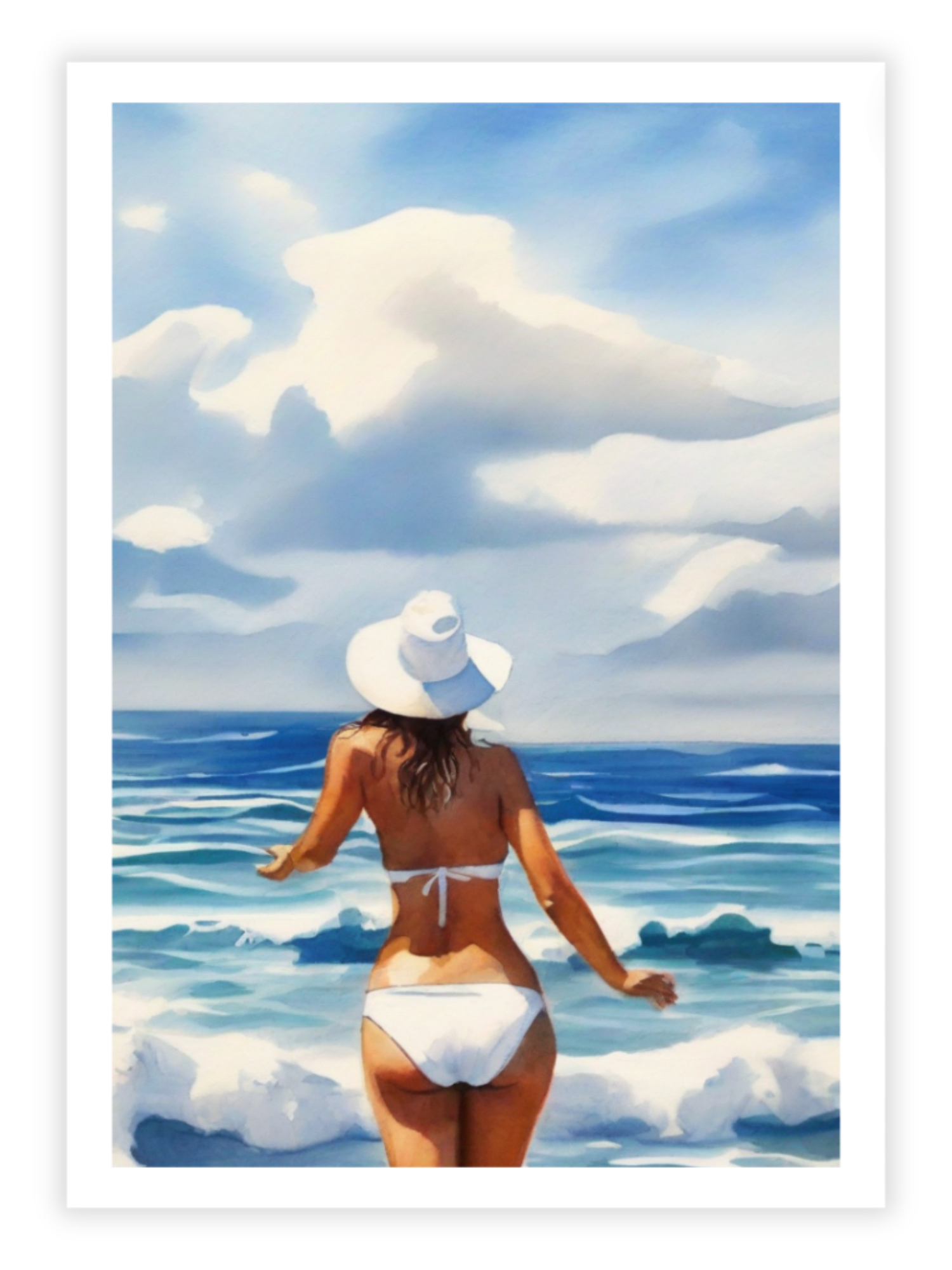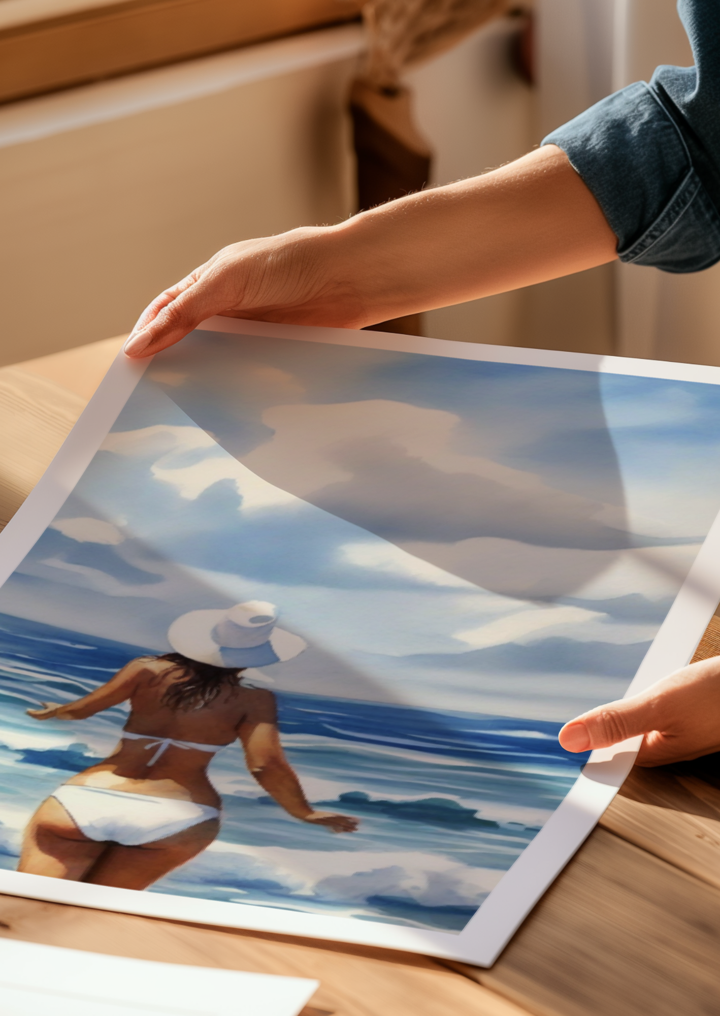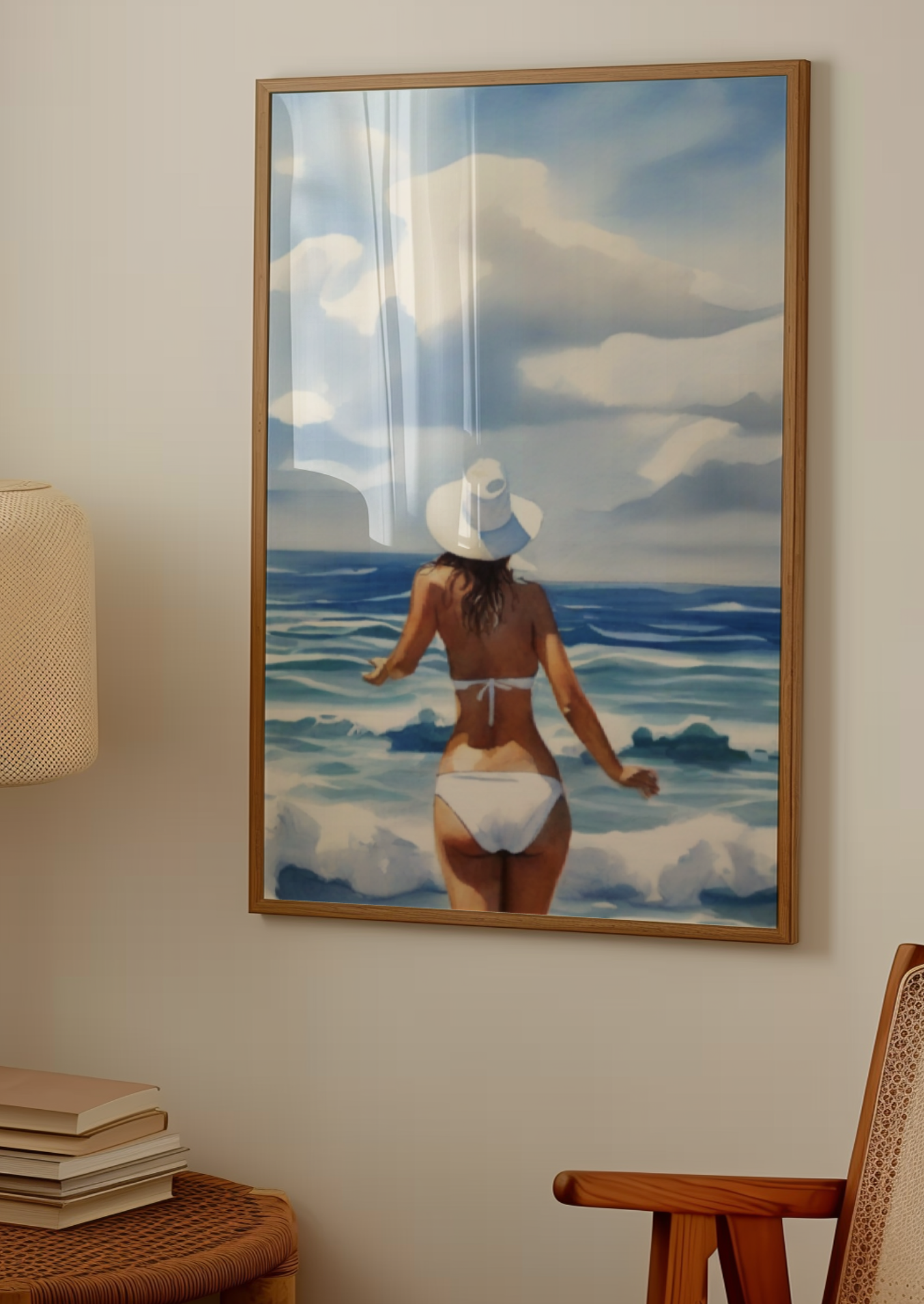 Dive into the tranquility of the ocean with this mesmerizing artwork. This piece captures a peaceful, powerful moment where the land meets the sea. A lady, dressed in a white swimsuit and wide-brimmed hat, stands with her back to the viewer, completely captivated by the rhythmic, cresting waves. The rich blues of the water contrast beautifully with the soft, ethereal clouds and the golden glow of the frame. This premium print is the ideal accent for anyone looking to infuse their space with the spirit of travel, summer, and relaxation. It works perfectly in bedrooms, bathrooms, or any area needing a touch of elegant coastal decor or ocean-inspired wall art.