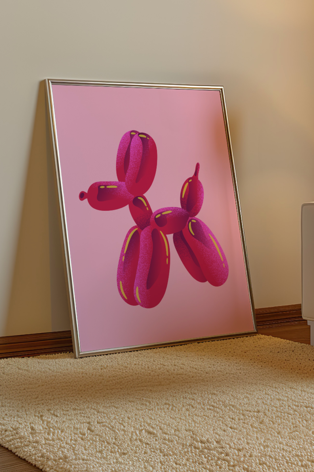 Make a bold statement with this vibrant Pink Balloon Dog Art Print. This playful illustration, inspired by classic contemporary pop art, features a stylish balloon animal dog rendered in eye-catching magenta and deep pink hues. It’s the perfect piece to add a fun, modern focal point to a bedroom, brighten up a creative studio, or inject personality into a dorm room or living area.