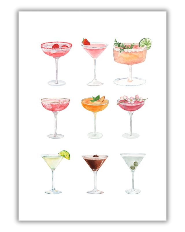 This unique illustration features a vibrant collection of nine classic and modern drinks, meticulously hand-painted to capture the brilliant colours and sophisticated garnishes of mixology.