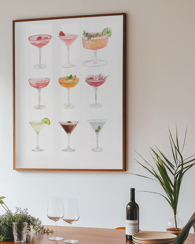 This poster is perfect for anyone looking to add a touch of stylish bar cart décor or a pop of colour to their living space. The artwork showcases a diverse array of glassware, making it a fantastic gift for cocktail lovers, or anyone who appreciates kitchen wall art with a spirited twist.