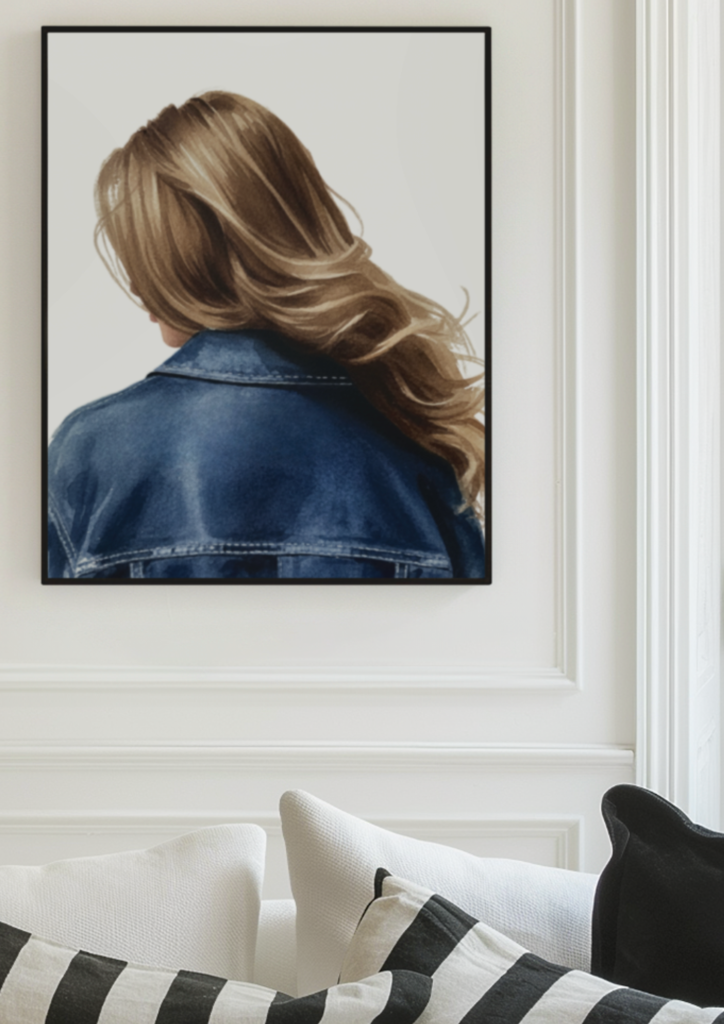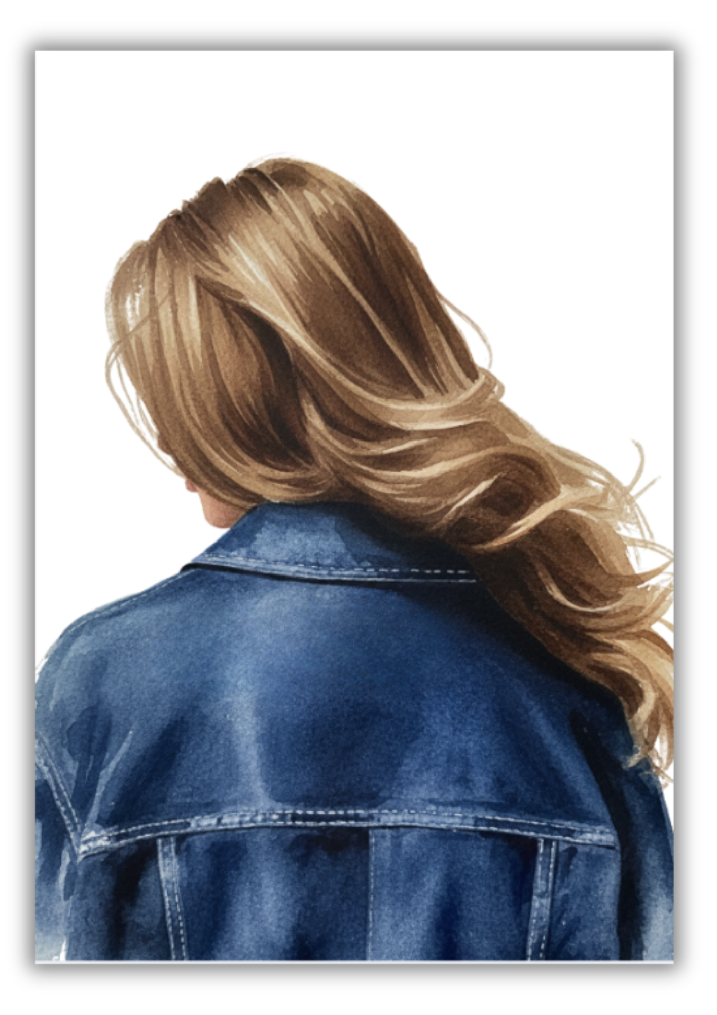 Bring a touch of modern sophistication to your home with this stunning minimalist art print. Featuring a soft, watercolor-style depiction of a woman from behind, this piece captures the timeless pairing of flowing blonde hair and a classic blue denim jacket. The clean, off-white background ensures it fits seamlessly into any contemporary interior, from Scandinavian-inspired spaces to industrial lofts.