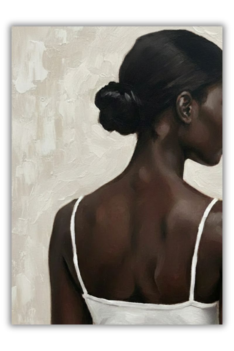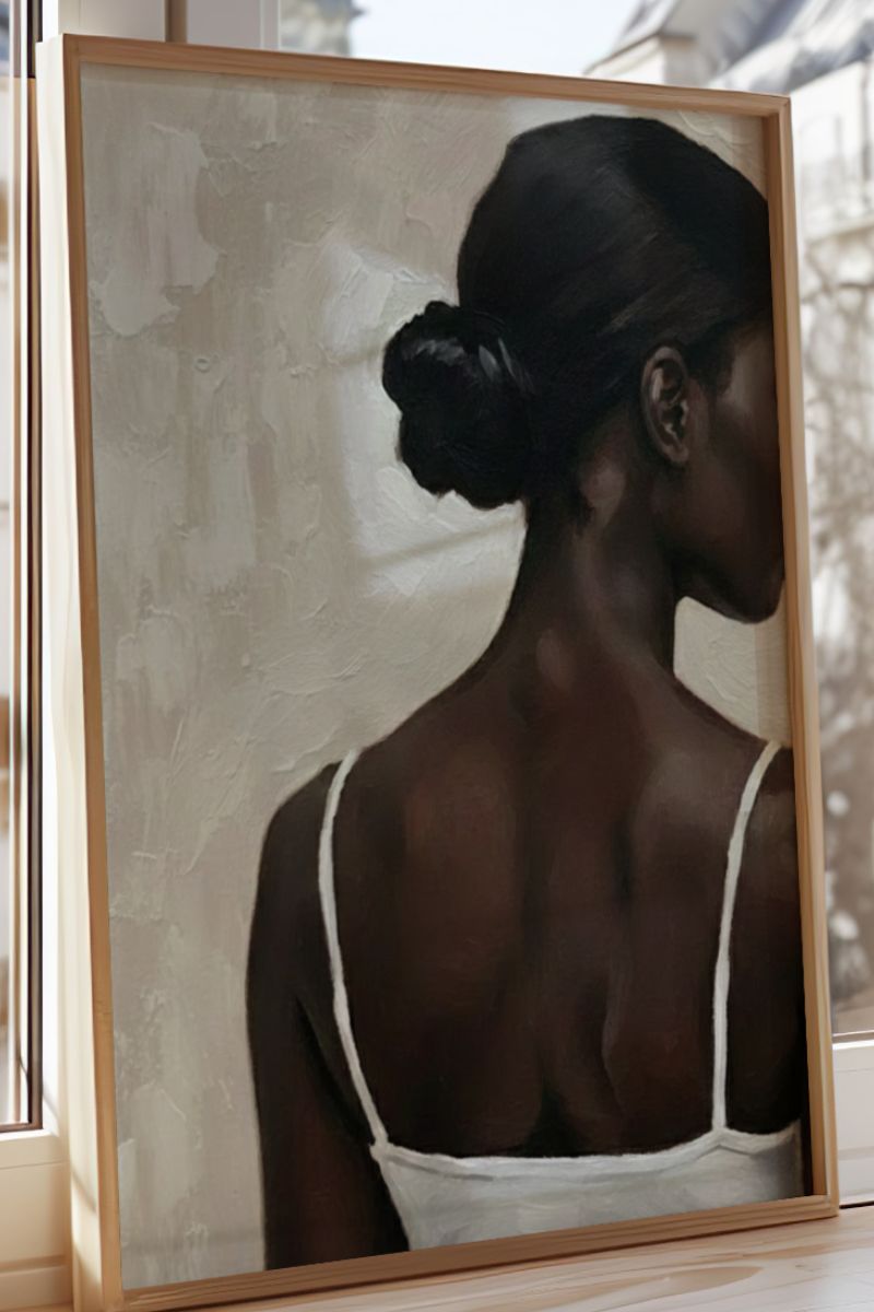 Transform your living space with this captivating impressionist oil painting print, featuring a graceful study of a woman’s back in a minimalist white bodice. This piece captures a quiet, serene moment, focusing on the elegant lines of the neck and shoulders and a classic low bun. The visible brushstrokes and rich texture bring a sophisticated, tactile feel to your walls.