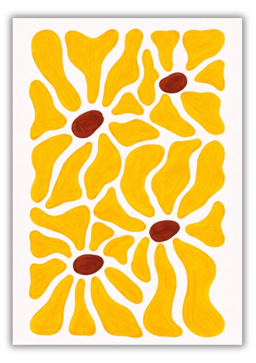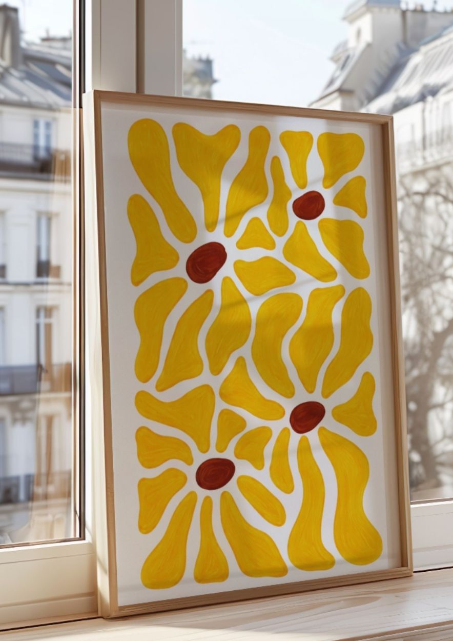 Transform your living space with this vibrant abstract yellow floral wall art print. Featuring a bold, mid-century modern aesthetic, this piece showcases stylized yellow daisies with warm ochre centers set against a clean white background. The fluid, organic shapes and sunshine-yellow palette are designed to bring a sense of energy and cheer to any room.